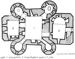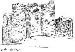 ა) ციხე-დარბაზის (8,4X7მ) კუთხეებში მცირე ზომის ცილინდრული (დიამ.2,5-2,7მ) კოშკები დგას. ერთ-ერთი კოშკისგან შემორჩენილია სამი სართული. I სართულზე (ამოვსებულია ნანგრევებით) დამხმარე სათავსოები უნდა იყოს: II სართული საცხოვრებელი და სათავდაცვო დანიშნულებისაა. აქ კედლებში მრავალი ნიში, სარკმელი, ცალმაგი და ორმაგი სათოფურია. სამხრეთით კარია, რომელსაც ეკლესიის მხრიდან კიბე ეკვრის. III სართულის ნაწილობრივ გადარჩენილ კედლებშიც დატანებულია სათოფურები, ნიშები და სარკმლები. კუთხის მცირე ზომის ცილინდრულ კოშკებს მხოლოდ თავდაცვისათვის იყენებდნენ.