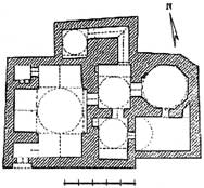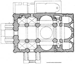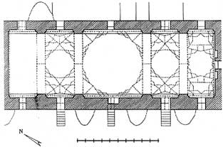 ტაძრის გეგმას საფუძვლად უდევს ჯვარი, რომლის სამი, ერთმანეთის ტოლი მკლავი ნახევარწრიული აფსიდით მთავრდება და ქმნის ეგრეთ წოდებულ ტრიკონქს. უაფსიდო დასავლეთი მკლავი წაგრძელებულია და აქვს გვერდითი ნავები, რომლებსაც ელიფსური ფორმის თაღების წყვილი მალით უკავშირდება. თაღები ვარსკლავისებურ ბოძზეა დაყრდნობილი. შესასვლელი დასავლეთიდან, სამხრეთიდან და ჩრთილოეთიდანაა.