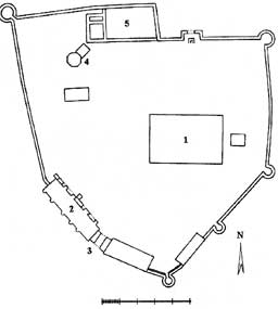 დ) 1640-43 ჩამოსული რუსი ელჩის ცნობით, ტაძრის პირდაპირ ქვით ნაგები ორი პალატი მდგარა. შემორჩენილია მხოლოდ ერთი, რომელიც ორსართულიანი მოგრძო ნაგებობაა (27X11 მ), დგას შესასვლელის დასავლეთით. იგი ჩართულია გალავნის კედელში და გარედან გამაგრებულია ხუთი მძლავრი კონტრფორსით. პალატის I სართულზე სატრაპეზო იყო. სამხრეთით მას სამი შესასვლელი ჰქონდა, რომელთა ზემოთ თითო თაღოვანი სარკმელია გაჭრილი. მსგავსი სარკმლები სხვა კედლებშიცაა.
