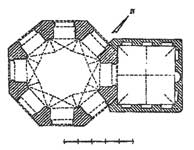 სათავსისაგან შედგება. კოშკის ქვედა იარუსის ყოველ კუთხეში თითო მძლავრი ბურჯი დგას, რომელთა შორის თითო ფართო შეისრულთაღოვანი ღიობია. ბურჯებითა და თაღებით შექმნილ ქვედა იარუსის რვაწახნაგოვან ბაქანზე დადგმულია ამდენივე წახნაგის მქონე ყელი, რომლის კედლები ქვედა ნაწილის კედლების სისქის ნახევარია, რის გამოც II იარუსის დონეზე შექმნილია ფართო გარშემოსავლელი. შიდა სივრცე ერთიანია, გადახურულია რთული ფორმის ორსაფეხურიანი კამარით. კოშკის ჩრდილო-აღმოსავლეთ წახნაგზე მიშენებული სათავსი კვადრატული გეგმისაა (5.2X5.2 მ), შესასვლელი მას კიოსკთან აქვს. სათავსის სამხრეთ და ჩრდილოეთ კედლებში სამ-სამი სწორკუთხა ნიშაა, აღმოსავლეთ კედელში, ნახევარწრიული ბუხრის ორივე მხარეს – თითო ნიშა.