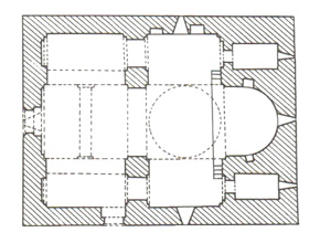 ეკლესია გუმბათოვანია (14,5×10,9 მ), ნაგებია ნატეხი ქვითა და აგურით. შესასვლელი აქვს ორი – სამხრეთით და დასავლეთით. გუმბათი საკურთხევლის კუთხეებს და დასავლეთის ორ თავისუფლად მდგომ ბოძს ეყრდნობა. გუმბათქვეშა და დანარჩენი თაღები და ასევე კამარები ისრულია. სამი საფეხურით ამაღლებულია ღრმა საკურთხევლის ნახევარწრიული აფსიდის სარკმლის გვერდებზე კვადრატული ნიშებია, ხოლო მათ ზემოთ – საიდუმლო სათავსებში ასასვლელი ხვრელები. ეს სათავსები მაღალია, გეგმით სწორკუთხა. მათ ქვეშ ასევე სწორკუთხა სამკვეთლო და სადიაკვნეა. დასავლეთის მკლავის კამარა დაკიდულ პილასტრზე გადასულ თაღზეა დაყრდნობილი. ჩრდილოეთი კედლის ნიშში სანათლავია. აფსიდის ღერძზე და სამივე მკლავში თითო სარკმელია, გუმბათის ყელში – თორმეტი. ეკლესიის ინტერიერი შეთეთრებულია.