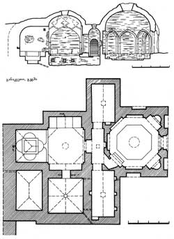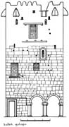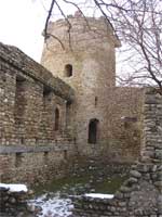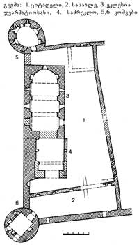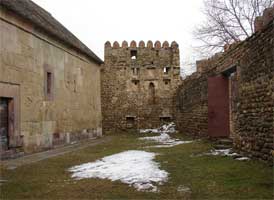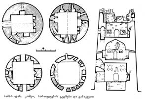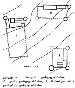 სასახლის ნანგრევები და გალავანი ცილინდრული კოშკებით;