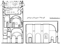 შესასვლელი ამჟამად სამხრეთიდან და ჩრდილოეთიდანაა (გაჭრილია XIX საუკუნეში). დარბაზი გადახურულია ორ საბჯენ თაღზე დაყრდნობილი კამარით. თაღები, კამარა და კონქი შეისრული ფორმისაა. ეკლესიაში შემორჩენილი მოხატულობის ფრაგმენტები XVII საუკუნეს განეკუთვნება. მოხატულობის კოლორიტს ძირითადად ქმნის მოწითალო-ყავისფერი, ღია ვარდისფერი, ოქროსფერი ოქრა. კომპოზიციები მინიატურული მასშტაბით ხასიათდება, წმინდანთა მოძრაობა დინამიკურია. ფასადებზე შემორჩენილია დეკორის ფრაგმენტები. არქიტექტურით, მხატვრობით და ფასადების დამუშავების ხასიათით ენათესავება XVII საუკუნის II ნახევრის ქართული არქიტექტურის ნიმუშებს (ანანური, ტბისი და სხვა).