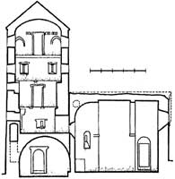 ა) თავდაპირველი ეკლესია გეგმით სწორკუთხაა (9X6,8 მ). შეიცავს ქრონოლოგიურად განსხვავებულ სამ სამშენებლო ფენას: თავდაპირველი ნაწილი რომელიც დასავლეთის და ჩრდილოეთის ფასადებზეა შემორჩენილი, მოზრდილი ზომის რიყის ქვის ირეგულარული წყობითაა ნაგები; მომდევნო ხანებში აღმოსავლეთისა და სამხრეთის ფასადები შირიმის სწორკუთხა ფილებით შეუმოსავთ, ხოლო უფრო გვიან კედლების ჩამოშლილი ნაწილები რიყის წვრილი ქვის წყობით აღუდგენია. შესასვლელი სამხრეთი კედლის დასავლეთ ნაწილშია გაჭრილი. კარი გარედან შირმის სოლისებრი ქვებით თარაზულადაა გადახურული, ხოლო შიგნით თაღოვანია. აღმოსავლეთით, ნახევარწრიული აფსიდის ღერძზე, ვიწრო სარკმელია, რომელიც მოგვიანებით მიშენებული კოშის II სართულზე გადის. სარკმლის ქვემოთ, კედელზე, მიდგმულია მთლიანი შირმის ქვის ტრაპეზი. ტრაპეზის წინა გვერდის ორივე კიდეს თითო ნახევარსვეტი ასდევს. დარჩენილ არეზე კი გამოსახულია საკმაოდ მაღალ ბუნზე დაყრდნობილი რელიეფური ჯვარი. აფსიდის სამხრეთის გვერდში თაღოვანი სარკმელია. იგი, როგორც ჩანს, კოშკის მიშენების შემდგომ მოუწყვიათ, ადრე არსებული ნიშის ადგილზე. თითო სარკმელია დასავლეთ, სამხრეთ და ჩრდილოეთ კედლებში. მათგან თავდაპირველი–მხოლოდ დასავლეთისაა. დანარჩენი ორი კი ისევე როგორც სხვა გადაკეთებები, მომდევნო ხანის სამშენებლო მოღვაწეობის შედეგია. აფსიდი გადახურულია წესიერი ფორმის კონქით. კონქის თაღს ნახევარწრიული ფორმა აქვს. რამდენადმე შემაღლებულია და შირმის თაროსებრ იმპოსტებს ეყრდნობა. მსგავსი ფორმისაა კამარის საბჯენი თაღიც, რომელიც კამარას ორ ართანაბარ ნაწილად ყოფს (აღმოსავლეთის ნაწილი რამდენადმე აღემატება დასავლეთისას) და აფსიდის თაღის ანალოგიურ იმპოსტებზეა დაყრდნობილი.