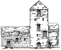 გ) კოშკი გეგმით კვადრატულია (6X6 მ), ხუთსართულიანი. ნაგებია რიყის ქვით. თაღოვანი შესასვლელი სამხრეთიდანაა, პირველი სართულის დონეზე. სართულის ჩრდილოეთ კედელში გეგმით ნახევარწრიული ბუხარია, მის ზემოთ – ნახევარწრიულთაღოვანი ნიში. აღმოსავლეთ კედელში იატაკიდან 1,3 მ სიმაღლეზე ვიწრო (სიმაღლე 1მ) ხვრელია. რომელიც კედელში არსებულ II და III სართულებზე ასასვლელ კიბეს უკავშირდება. სართული გადახურულია ნახევარცილინდრული კამარით. II სართულის დასავლეთ და ჩრდილოეთ კედლებში კედლის მთელს სიგანეზე, თითო ღრმა შეისრულთაღოვანი ნიშია. სართულის სამხრეთ–აღმოსავლეთ კუთხეში მოწყობილია კარი, რომელიც კოშკის სამხრეთ ფასადზე მდებარე ორფერდასახურავიან ბაქანზე (ბაქანიც და სახურავიც ჩამოშლილია) გადიოდა. სართულის აღმოსავლეთ კედელში მაღალი სწორკუთხა სარკმელია, სამხრეთ კედელში კი –სათოფური. ერთი სათოფურია ბაქანზე გასასვლელის აღმოსავლეთ წირთხლშიც. აღმოსავლეთ სარკმელთან ახლოს (ჩრდილოეთით) კიბის უჯრედში შესასვლელი ვიწრო კარია. სართულს ხის კოჭებზე გამართული ბრტყელი გადახურვა ქონია (შემორჩენილია კოჭების საყრდენი ბუდეები). მსგავსად ყოფილა გადახურული კოშკის III და IV სართულებიც. III სართულის სამხრეთ კედლის შუაში ხის პატარა აივანზე გამავალი ფართო სწორკუთხა კარია, ხოლო აღმოსავლეთით ერთი სწორკუთხა სარკმელი. IV სართულის კედლებში ექვსი სათოფურია: ორ–ორი სამხრეთითა და ჩრდილოეთითაა ხოლო თითო–თითო აღმოსავლეთითა და დასავლეთით. V სართულის სამხრეთ კედელში ხის აივანზე გასასვლელი კარია. დანარჩენ კედლებში კი თითო სათოფური. სართული გადახურულია გუმბათოვანი კამარით, რომლის წრიული საფუძველი ოთხივე კუთხეში განლაგებული ტრომპებითაა შექმნილი. გარედან კოშკის კედლები დასრულებულია შირმის თხელი ფილებისაგან შედგენილი თაროსებრი ლავგარდნით. კოშკს ოთხფერდა, პირამიდული ფორმის გადალესილი სახურავი აქვს.