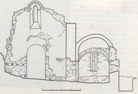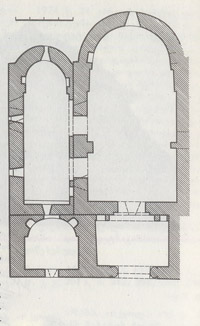ბ) მინაშენი (10,8X3,2 მ) აფსიდიანია. კამარის აღმოსავლეთი ნაწილი უფრო მაღალია ვიდრე დასავლეთის. სამხრეთით კამარა ეკლესიის ჩრდილოეთ ფასადიდან ამოყვანილ ვიწრო კედელს ეყრდნობა. აფსიდის ღერძზე ერთი სარკმელია, ჩრდილოეთ კედელში – ორი.