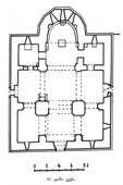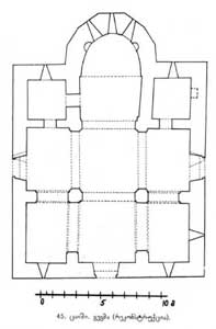 ტაძრის ძირითადი შიდა სივრცე შექმნილია ჯვრის ფორმის გეგმაზე აღმართული მასებითა და ცენტრალური გუმბათით. ამ ჯვრის ჩრდილო და სამხრეთის სწორკუთხა მკლავები მოკლეა, ხოლო დასავლეთისა და აღმოსავლეთის – დაგრძელებული. აღმოსავლეთის მკლავი მთავრდება საკურთხევლის აფსიდით. საკურთხევლის გეგმა მთლიანად უწესოა, ასევე არაწესიერ გეგმაზეა აგებული ბემაც. აფსიდის და ბემის არაწესიერი ფორმა და აფსიდის კედლის სისქის განსხვავება დანარჩენი კედლებისაგან გვიკარნახებს, რომ აქ გადაკეთებასთან გვაქვს საქმე. საკურთხეველი გვერდიგვერდ, საკმაოდ მჭიდროდ განლაგებული სამი სარკმლიდან შემოსული შუქით ნათდება. როგორც მთელი აფსიდი კონქით, ისე ბემაც კარგად თლილი კვადრებითაა ამოყვანილი, სადაც ნალესობა ჩამოცვენილია, ძალიან წესიერი წყობა ჩანს. საკურთხევლის გვერდით ოთახები, სადიაკვნე და სამკვეთლო, გეგმით თითქმის კვადრატია. ისინი გადახურულია გარე კედლებზე დაყრდნობილი კამარებით. ამ სადგომებს ანათებს აღმოსავლეთის კედელში გაჭრილი თითო სარკმელი. სამკვეთლოში სარკმელზე მიდგმულია ერთი ახალი ტრაპეზე, სადიაკვნეში კი – ორი. აღსანიშნავია გუმბათქვეშა მასიური პილონები (200X210 სმ), რომელთა წიბოები 450-ითაა ჩამოჭრილი და შემოსილია თლილი ქვით. ამ პილონებზე გადასული თაღით გუმბათქვეშა სივრცეს უერთდება ორსართულიანი დასავლეთის მკლავი; ზედა სართულში პატრონიკეა მოთავსებული, ხოლო ქვედა ნაწილი ცილინდრული კამარითაა გადახურული და სამმხრივ ღიადებით უერთდება მომიჯნავე ნაწილებს. პატრონიკე XVII საუკუნის აღდგენის დროსაა აგებული საკმაოდ უმწეოდ. ყველა კედელი დაბრეცილია, გადამხურავი ცილინდრული კამარა ოვალური ფორმისაა, ტალღობრივი ზედაპირით. საიდუმლო ოთახები მოთავსებული ყოფილა საკურთხევლის გვერდითი სადგომების ზემოთ, მეორე სართულზე. აღდგენის შემდეგ ეს ოთახები გამოსულა ხმარებიდან. ამ სადგომებს ერთი საყურადღებო დეტალი აქვთ: მათ აერთიანებს ერთმანეთთან ვიწრო `გვირაბი~ (49X60 სმ), რომელიც იწყება ორივე სადგომის საკურთხევლისაგან გამყოფი კედლიდან და მიჰყვება აფსიდის მომრგვალებას. გვირაბი გადახურულია საკმაოდ ფართო და ბრტყელი ორი კრამიტის ერთმანეთზე მიბჯენით მიღებული სრული კამარით. ამ ხვრელში გასვლა მხოლოდ მუცელზე ხოხვით ხერხდება.