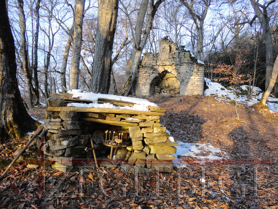 გ) ეკლესიის დასავლეთით, ოთხიოდე მეტრზე, მიჯრით მდგარი, ორი სხვადასხვა ზომის ნაგებობის კედლების ნაწილებია შემორჩენილი. მესამე ნაგებობის (შიდა ზომები: 6,4x3,8 მ) ნანგრევები ეკლესიის სამხრ-დასავლეთ კუთხესთანაა. სამივე ნაგებობა გეგმით ოთხკუთხაა და ზურგის კედლით გალავანშია ჩართული. ეკლესიის დასავლეთით მდგარ მოზრდილ ნაგებობას (შიდა ზომები:7,4X5,4მ) შესასვლელი აღმოსავლეთიდან აქვს. კარი ვიწროა და ისრული თაღი ხურავს. ჩრდილოეთ კედელში ორი მცირე ზომის სწორკუთხა ნიშია. მეორე ნაგებობას (შიდა ზომები:4,1X2,2 მ) რომელიც მოზრდილ ნაგებობაზე, მახვილი კუთხით, ჩრდილოეთიდანაა მიდგმული, შესასვლელი აღმოსავლეთიდან აქვს. დანარჩენი კედლები ყრუა. ეკლესიის ჩრდილოეთით შემორჩენილია კედელი (სიგრძე 6,5 მ,სიმაღლე 1,2-1,5 მ) რომელიც გალავნიდან მოემართება და ეკლესიის ეკლესიის ჩრდილოეთ კედელს ადგება.