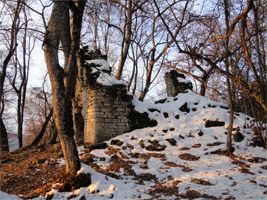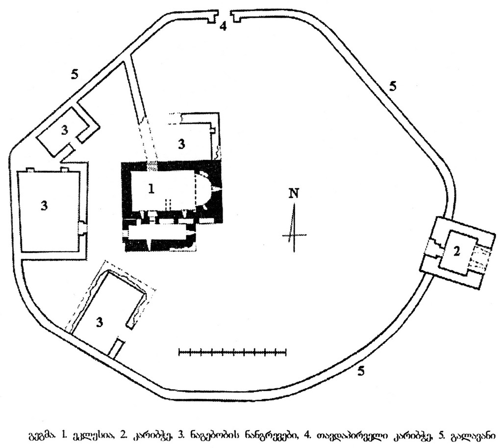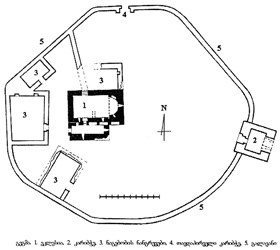 დ) გალავანი გეგმით თითქმის წრიულია (39X35 მ) მის ჩრდილოეთ კედელში მოწყობილი ყოფილა ვიწრო შესასვლელი (თავდაპირველი კარიბჭე?), მისგან მხოლოდ კვალია შემორჩენილი.