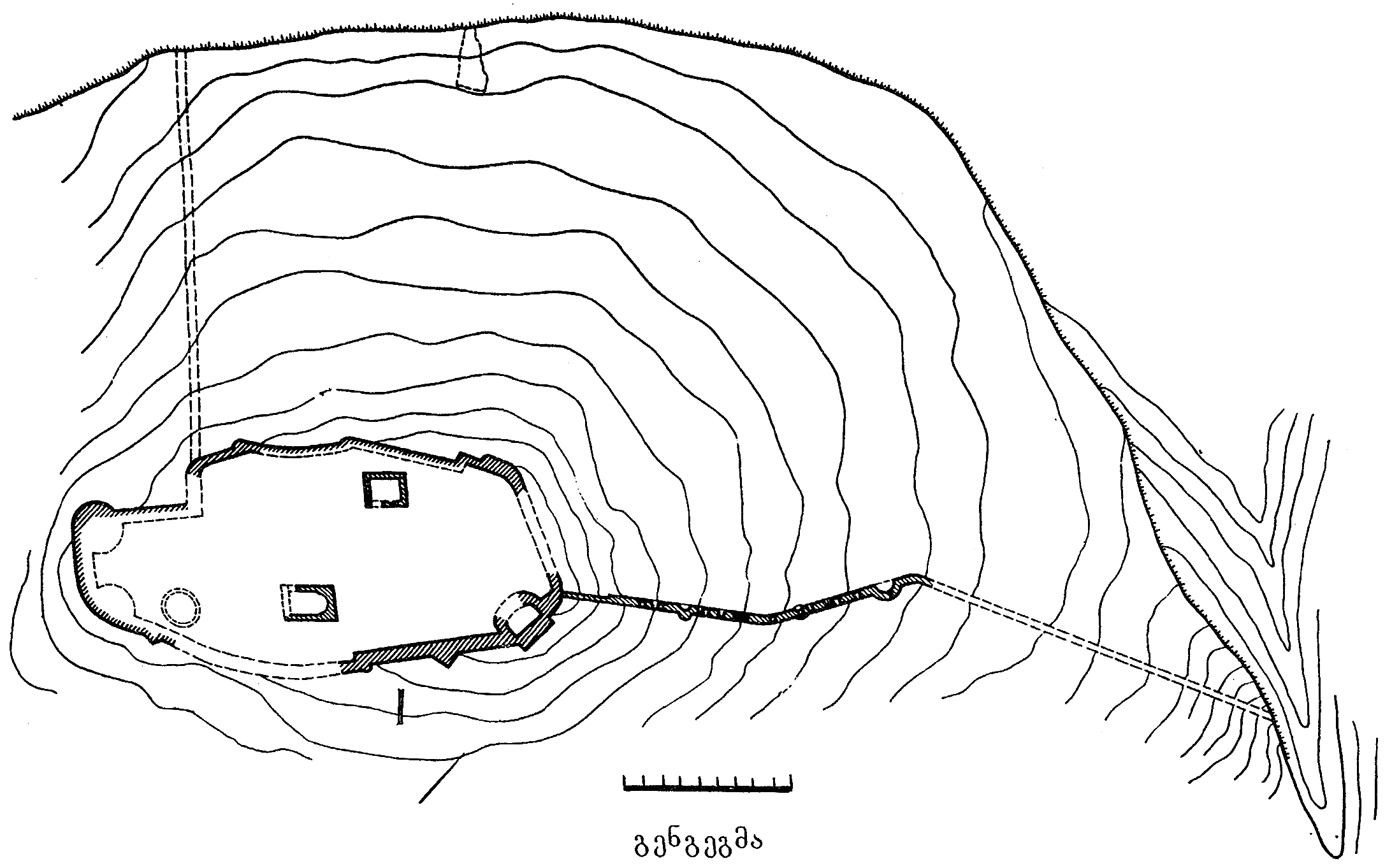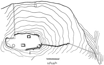 გალავანი, კარის ეკლესია, წყალსაცავის და სახლების ნაშთები.