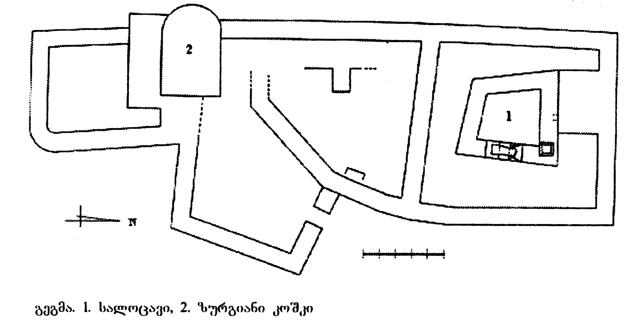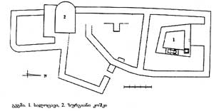 ბ) გალავანი ტეხილი მოხაზულობისაა. სიმაღლეში დაბალია (1,5X2 მ).