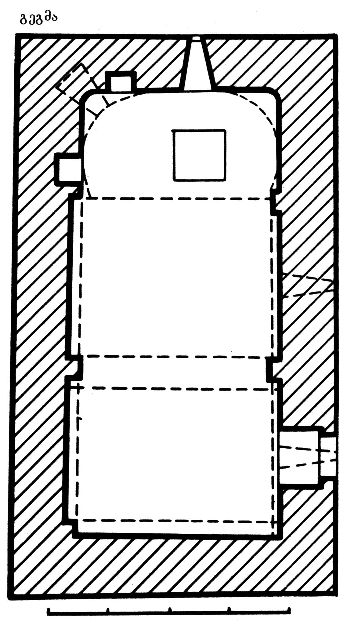 eklesia დარბაზულია (9,35X5,35 მ), ნაგებია ქვიშაქვის დიდი ქვებით. სატრიუმფო და საბჯენი თაღები გათლილი შირიმისაა. შიგნიდან არქიტრავიანი, გარედან თაღოვანი შესასვლელი სამხრეთ კედლის დასავლეთ ნაწილშია. აფსიდის ღერძზე თაღოვანი სარკმელია; საკურთხეველი ქვემოთ სწორკუთხაა, ზემოთ კი კონქის საფუძვლის ნალისებრ ფორმაში გადადის. ამის გამო საკურთხეველთან მიმდებარე პილასტრები ზემოთკენ თხელდება და გარკვეულ სიმაღლეზე აფსიდის კედლის სიბრტყეს უსწორდება. სამხრეთ კედელში ორი სწორკუთხა სარკმელია. სატრიუმფო თაღი თაროსებრ იმპოსტებს ეყრდნობა, ცილინდრული კამარა – პილასტრებზე დაყრდნობილ საბჯენ თაღს. დასავლეთ კედლის შეკიდული საბჯენი თაღი შეტეხილი ფორმისაა. ეკლესია შიგნით შელესილია.