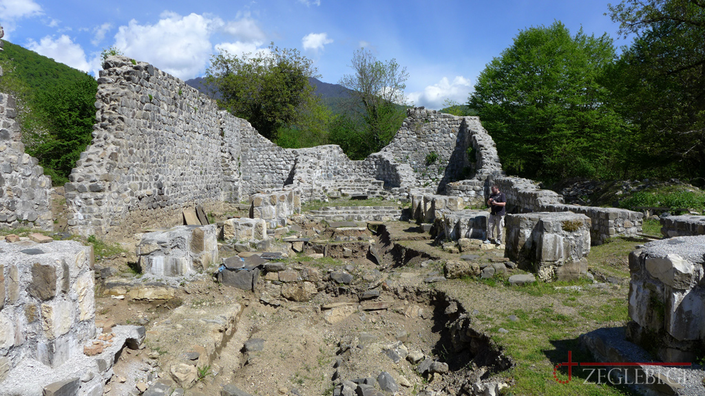 საკურთხევლის მარჯვნივ და მარცხნივ, გვერდითა ნავების გაგრძელებაზე, სწორკუთხა გეგმის პასტოფორიუმები – სავარაუდოდ სადიაკვნე და სამკვეთლოა მოწყობილი, შესასვლელებით ამ ნავებიდან. ინტერესი გამოიწვია იმ გარემოებამ, რომ საკურთხევლის ჩრდილოეთით მდებარე პასტოფორიუმს, თავდაპირველად დამატებითი, ჩრდილოეთიდან შესასვლელი კარიც ჰქონია. ეს დეტალი თითქოს ეჭქვეშ აყენებს შესაძლებლობას ოთახის იმთავითვე სამკვეთლოს ფუნქციით მოწყობის შესახებ, თუმცა, ისიც უნდა ითქვას, რომ მოგვიანებით (დაახ. ტაძრის აგებიდან 1-2 საუკუნის შემდეგ), ეს კარი ქვითკირის შედარებით ვიწრო და სუსტშემკვრელიანი წყობით ამოუშენებიათ და გაუუქმებიათ. ეს მოქმედება, შესაძლოა, სწორედ ლიტურგიის წესის ცვლილებაზე და სათავსოს ამჯერად უკვე დანამდვილებით სამკვეთლოს დანიშნულებით გამოყენებაზე მიგვითითებდეს. რაც შეეხება სამხრეთის პასტოფორიუმს, მას აღმოსავლეთ კიდეში საკურთხევლის თავისებურება იმაშიც გამოიხატება, რომ თითქმის 3 მ-ზე მაღალ ნიშნულზე შემორჩენილ არც ერთ მის კედელში არ ჩანს დატანებული სარკმელი ან სასინათლე ხვრელი. ალბათ უნდა ვიფიქროთ, რომ ამ ოთახს სარკმელი მაინც ექნებოდა, ოღონდ სამხრეთის კედლის ძალზე მაღალ რეგისტრში დატანებული, და ის ნგრევისას აღარ შემორჩა. როგორც იატაკებზე და ნანგრევებში მიმოფანტული, ნათალი, ცალმხრივ მორკალული შირიმის ბლოკების ფორმების შესწავლით დავრწმუნდით, ისინი მხოლოდ ბაზილიკის ნავებად დამყოფი სვეტების ერთმანეთთან გრძივად დამაკავშირებელი თაღების, აგრეთვე კარების და სარკმელების ზემოდან მომზღუდავი თაღების ელემენტებია – მათ შორის სრულიად არ შეგვხვედრია მორკალული დეტალები, რომლებიც შეიძლებოდა ნავების გადამხურავი კამარების საბჯენი თაღების შემადგენელ ნაწილებად მიგვეჩნია. ამდენად ბაზილიკის ნავების ქვის კამარებით გადახურვა ფრიად საეჭვო იყო. ეს გარემოება და თავდაპირველი იატაკის დონეზე, ნახშირის ნაწილაკების შემცველ, დამწვარ კრამიტებიან ფენასთან ერთად აღმოჩენილი დიდი ზომის, ათეულობით ნაჭედი ლურსმანი (ე.წ. „ყადაღები“) იმაზე მეტყველებს, რომ ეს ბაზილიკა ხის კონსტრუქციებზე დაყრდნობილი კრამიტის საბურველით ყოფილა გადახურული. გათხრებისას დიდი რაოდენობით გამოვლინდა კრამიტით გადახურული სახურავების ფერდების დაბოლოებებზე გაყოლებული, თიხის ცალმხრივ დაკბილული და თეთრ-წითლად მოხატული ანტეფიქსების ფრაგმენტები. ისინი უმთავრესად კოლონების გრძივი მწკრივების და კედლების გასწვრივ დაფიქსირდა, რაც იმაზე მიგვანიშნებს, რომ ბაზილიკის შუა ნავი გვერ