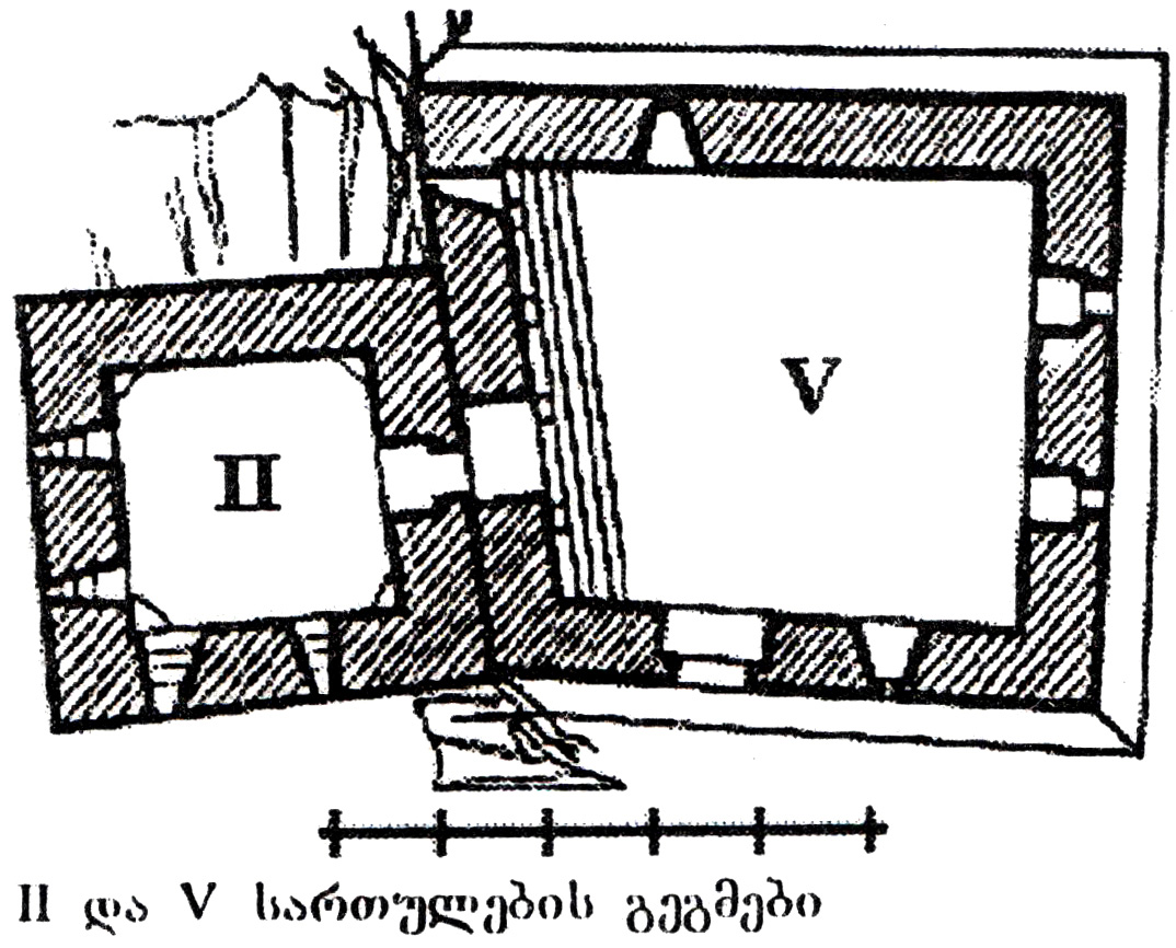 ა) ხუთსართულიანი (ხუთთვალიან) სახლს (6,6X5 მ) შესასვლელი პიველ სართულზე აქვს, ჩრდილო-დასავლეთიდან, მტრიდათვის ძნელად მისადგომი მხრიდან. პირველი სართულის დამნარჩენი სამი კედელი ყრუა. სხვა სართულებზე თიოთო კარია და სათოფურები. აღმოსავლეთ ფასადზე, მეორე სართულის დონეზე, შემორჩენილია ქვის სამი კონსოლი, რომლებზედაც ხის აივანი იყო გამართული.