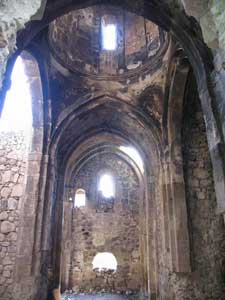 ტაძარი მიეკუთვნება ნახევრადთავისუფალი ჯვრის ტიპს. აღმოსავლეთ მკლავი არის აფსიდალური, დანარჩენი მკლავები – ოთხკუთხა. საკურთხეველს აფსიდის გარდა, მცირე ბემა აქვს. აფსიდის ცენტრში დიდი სარკმელია. საკურთხევლის გვერდით განლაგებულია სადიაკვნე და სამკვეთლო. ამ სათავსებს ერთი ზომა აქვთ, მათი კვადრატული ნაწილები გადახურულია კამარებით, მათი აფსიდები კი კონქებით. ყოველი მათგანი ნათდება მცირე სარკმელებით აღმოსავლეთიდან სადიაკვნე და სამკვეთლო ჯვრის გვერდითა მკლავებს უერთებიან გაჭრილი კარებით. ჯვრის მკლავები გადახურულია ისრული კამარებით. გვერდითა მკლავები მოკლეა, დასავლეთის მკლავის სიგრძე თითქმის სამჯერ აღემატება დანარჩენი მკლავების სიგრძეს. მას ორი შესასვლელი აქვს: ერთი დასავლეთის მკლავის დასავლეთ კედლის ცენტრში, მეორე ამავე მკლავის სამხრეთ კედელში, ორივე შესასვლელი ამჟამად ფორმადაკარგულია. ინტერიერი კარგად ნათდება. თითო სარკმელი არის საკურთხევლის აფსიდში, ჩრდილოეთისა და დასავლეთის მკლავებში, ორი გვერდი–გვერდ, თხელი სახსრით გაყოფილი – სამხრეთის მკლავში, ოთხი – გუმბათის ყელში. ყველა სარკმელი ფართოა და მაღალი. პასტოფორიუმებს აფსიდებში გაჭრილი თითო უფრო მომცრო სარკმელი ანათებს.