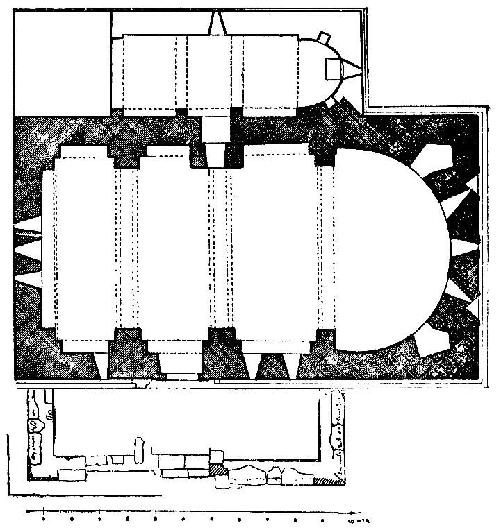 გ) ზღუდის გარეთ იდგა პატარა ერთნავიანი ტაძარი – საჟამნო, რომელიც ძალიან ცუდადაადაცული. მისი კედლები მოპირკეთებული იყო ლეგა-მოყვითალო ქვიშაქვით და მოყავისფრო-ღვინისფერი ფილაქნით. ყვითელი და ღვინისფერი ქვების რიგები ენაცვლება ერთმანეთს. მეექვსე რიგი ჭრელია: ღვინისფერი კვადრი, შემდეგ ყვითელი და ასე შემდეგ. კედელს აგვირგვინებს ყვითელი ქანის ჩუქურთმიანი ლავგარდანი. ორფერდა სახურავი ბეტონის სახითაა დაცული აფსიდის კონქის ნაშთითურთ შიგნით. სახურავი, როგორც ტაძრის გარშემო ნაპოვნი ნაშტი გვიჩვენებს, ლეგა-მომქვანო ქანის ლილვაკიანი ლორფინებით ყოფილა დაფენილი (სამრეკლოსავით). აფსიდის თლილი ქვის პერანგის ზედაპირი შიგნით გალესილი ყოფილა ბათქაშით. ნაშთების მიხედვით ტაძარი ფრესკული მხატვრობით უნდა ყოფილიყო შიგნით, გარედან კი იგი უხვად ყოფილა შემკული ჩუქურთმით. ლავგარდანი სულ ერთიანად მოჩუქურთმებული ყოფილა და თან სხვადასხვავა ფასადზე სხვადასხვანაირად.
