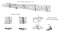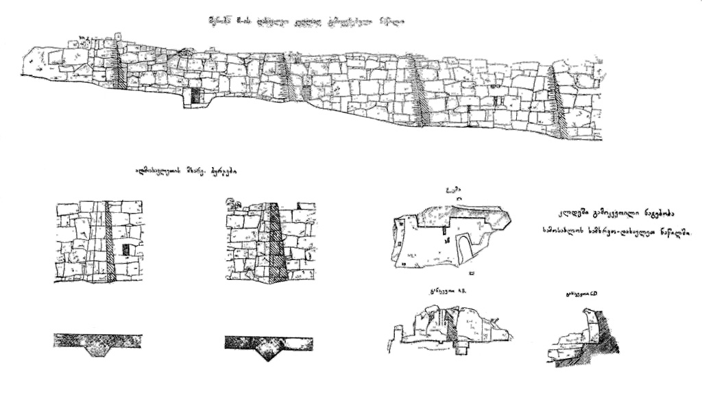 ზღუდის კედელი თლილი ქვის პერანგითაა შემოსილი, ქვა უმეტეს წილად დიდი ზომისაა (1,55X0,57, 1,38X0,40, 1,20X0,62 მ), მაგრამ არის საშუალო ზომის და წვრილი ქვაც, თუმცა ასეთი ხშირად შენაკეთებ ადგილებშია. ქანი ყველგან ერთია: ეს არის ფოროვანი, მძიმე და მტკიცე, თუმცა მყიფე, მსხვილმარცვლოვანი კირქვა, რომელსაც ამჟამად ლეგა ფერი აქვს, მაგრამ თავის დროზე მოთეთრო ყოფილა. ბეტონი ნაგლეჯი ქვისა და ქვითკირისაგან შედგება. ქვითკირი სუსტია, ადვილად იფხვნება, რადგან მის მოსამზადებლად მიწიანი ქვიშა უხმარიათ, ამიტომ კედლის პერანგის კილოებში ქვითკირი მთლიანად გამოფიტულა და წყობა, ერთი შეხედვით, ყორული ჩანს.