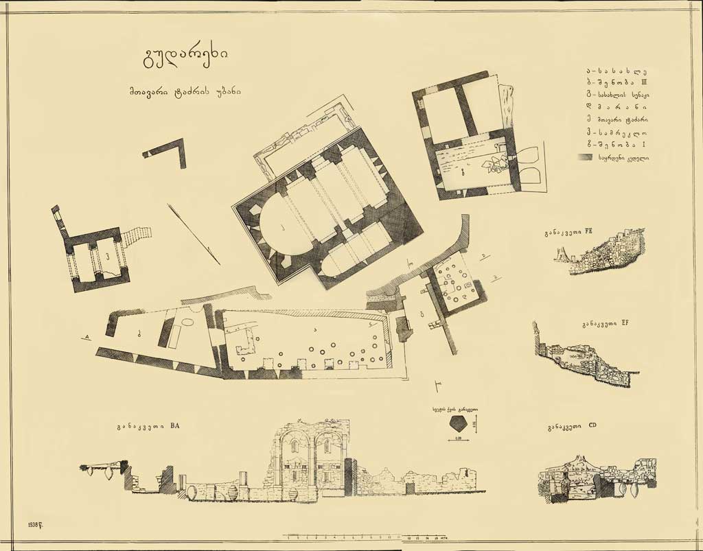 ა) გუდარეხის მთავარი ტაძარი აშენებულია რუსუდანის მეფობის დროს, XIII საუკუნის მეორე მეოთხედში. ეს თლილი ქვით ნაგები დიდი ერთნავიანი შენობაა, შიგნით ბათქაშით გალესილი, აქა-იქ ფრესკების ნაშთებით კედლებზე, ძალიან დაშავებული. მას ორი მინაშენი ჰქონია. ჩრდილოეთიდან მიშენებულია ეგვტერი, რომლის მოგვიანებით აშენებას გვიჩვენებს ის გარემოება, რომ დაუფარავს ტაძრის ჩრდილოეთ კედლის თლილი ქვის პერანგი, რომლითაც ამ კედელს არ შემოსავდნენ, აქ რომ ეგვტერის აგება ყოფილიყო ჩაფიქრებული. ეგვტერისათვის ძველი ნათალი ქვებიც გამოუყენებიათ, რომელთაგან ზოგი უთუოდ მთავარ ტაძარზედაც უფრო ძველია, ეგვტერის ჩრდილოეთის კედელში ჩასმულია ორი წარწერიანი ქვა და ეს წარწერები პალეოგრაფიულად X-XI საუკუნეებზე მიგვითითებს. ერთ ქვაზე, რომელიც ტორსზე დგას, ისე რომ წარწერა ვერტიკალურადაა დაყენებული ამოკვეთილია მსხვილი მთავრული ასოებით `ქრისტე შეიწყალე გიორგი~, თვითონ ეს მდგომარეობა კედელში ცხადჰყოფს, რომ იგი სხვა ადგილიდან არის მოტანილი და მეორედ გამოყენებული – წარწერას ვერტიკალურად არავინ მოათავსებდა. მეორე ქვაზე ამოკვეთილია `ქრისტე შეიწყალე ადამ~. ორივე ეს წარწერა მიგვითითებს, რომ ალბათ, მთავარი ტაძრის ადგილსავე, რუსუდანამდე ყოფილა უკვე რაღაც ძველი, ყოველ შემთხვევაში X-XI საუკუნის ნაგებობა.