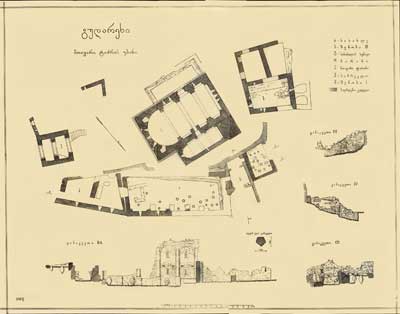 გარდა საკულტო ნაგებობებისა, რომელთაგან მთავარი ტაძარი და სამრეკლო განსაკუთრებით საინტერესოა იმით, რომ შედარებით ზუსტადაა დათარიღებული (პირველი რუსუდანის, ხოლო მეორე დემეტრე II-ის მეფობით), იმ შენობათაგან რომლებიც ზედაპირულად მეტნაკლები სისრულით არის შემონახული, აღსანიშნავია ზედა ბაქნის სამხრეთ-აღმოსავლეთ ნაწილში მდებარე ნაგებობა, რომლებიც ერთმანეთზეა მიკრული და რომლებსაც `ჩუქურთმიანი შენობის კომპლექსი~ დაერქვა. სამივე შენობა ორიენტირებულია აღმოსავლეთისაკენ. სამხრეთიდან ჯერ მოდის ე.წ. `ჩუქურთმიანი შენობა~, შემდეგ სენაკი, რომელსაც ჩრდილოეთიდან აკრავს ე.წ. `ჯვრიანი შენობა~. ეს შენობები ე. თაყაიშვილს კლესიებად მიუჩნევია, მაგრამ ლ. მუსხელიშვილის აზრით ესე არ არის. ყველაზე ადრე აშენებულია სენაკი. `ჩუქურთმიანი შენობა~, რომელსაც ეს პირობითი სახელი იმიტომ ეწოდა, რომ იგი ჩუქურთმით შემკულ საცხოვრებელ სახლს წარმოადგენს, და `ჯვრიანი შენობა~ მერეა მიშენებული სენაკზე.