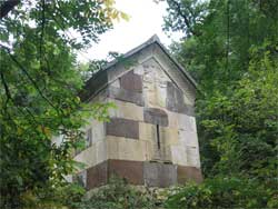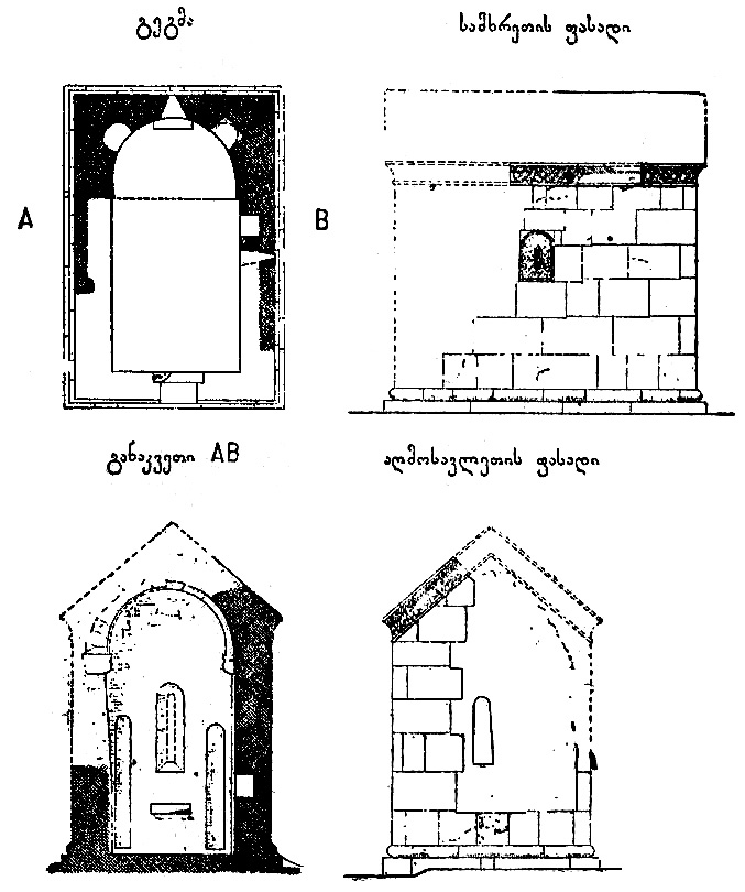 ე) `ჩუქურთმიანი შენობაც~ პატარა, უსწორო ოთხკუთხა სადგომს წარმოადგენა. მისი სიგრძე დაახლოებით 2,79 მეტრია, სიგანე დაახლოებით 2,59 მ. მისგან შემორჩენილია მხოლოდ აღმოსავლეთის და ჩრდილოეთის კედლები. არავითარი ნიშანი საკურთხევლისა აქაც არ ჩანს, პირიქით, კარი აღმოსავლეთის კედელშია გაჭრილი. ამ შენობის კედელები შემოსილი იყო თლილი ქვის პერანგით, რომელშიც ჩასხმული იყო ჭყორდუღაბი. ლავგარდანი აღარ არსებობს, ამიტომ კედლების სიმაღლე ვერ ირკვევა. გარედან შემორჩენილი აღმოსავლეთის კედელი შემოსილია ლამაზი, კარგად გათლილი ღვინისფერი ფილაქნებით. შიგნით კედლის საპირე ქვა უფრო მქისეა, მაგრამ ბათქაშის კვალი არ ჩანს. ამ კედელში მოთავსებულია შენობის კარი, რომელიც გარედან მოჩუქურთმებული ჩარჩოთია შემკული. კარის სამხრეთით ამავე კედელში პატარა, ვიწრო, აგრეთვე მოჩუქურთმებული სარკმელია გამოჭრილი მთლიან ქვაში. შენობის სამხრეთ-აღმოსავლეთ კუთხეში, გარედან ერთი კუთხის ქვა, რომელიც თითქმის ზედ ნიადაგის ზედაპირის დონეზე მოდის, ნაცხვირიანია: შესაძლებელია, ეს ნაცხვირი ცხენის დასაბმელად იყო განკუთვნილი.