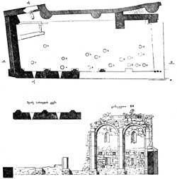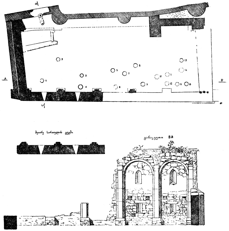 შენობა დაფუძნებულია კლდეზე, რომლის მასივები ალაგ-ალაგ, განსაკუთრებით სამხრეთ-დასავლეთ მხარეზე, შიგ შენობაშია შეჭრილი, სამხრეთ-დასავლეთით კლდე იატაკის ზედაპირიდან მაღლა ამოდის და ძველადაც ასევე გაშიშვლებული იქნებოდა მარნის შიგნით. გათხრების დროს გაშიშვლდა ჩრდილო-აღმოსავლეთის კედლის საძირკველი და გამოვლინდა, რომ ის ნაგლეჯი ქვითაა წყობილი და შიგნიდან კონრფორსებით იყო გამაგრებული. ასევე გათხრების დროს ნაპოვნია მარნის ქვევრები და რამდენიმე ადგილას დაფიქსირდა ადრინდელი იატაკის დონე, რომელიც შემორჩენილია ქვითკირის ნაშთების სახით, ნაპოვნია წვრილი ინვენტარი (გიორგი III-ის მონეტა, დამახასიეთებელი კერამიკული ნატეხები დას სხვა), რაც საშუალებას იძლევა ეს შენობა XII საუკუნით დათარიღდეს. კედლის შემორჩენილი ნაწილი გარედან, ნიადაგის თავდაპირველი დონიდან რომ ვიანგარიშოთ, აღწევს 7,8 მეტრ სიმაღლეს. ზევით მას შემონახული აქვს ლავგარდანის ქვა, ლავგარდანი უბრალო ფიტონს წარმოადგენდა, რომელიც მოგრძო ოთხკუთხი ბრტყელი ფილაქნებისაგან შედგებოდა. მხოლოდ კუთხის ქვა აქვს დაქანებული ნაპირები და წარზიდული ნაწილი, რომელიც კუთხეს ამთავრებს. გარედანაც და შიგნიდანაც ჩრდილო-აღმოსავლეთის კედელი თლილი ქვებითაა შემოსილი, ამ პერანგში ჩასხმულია ბეტონი და მისი სისქე 1,0 მეტრს შეადგენს. გარეთა საპირე ქვა კარგადაა გათლილი, პერანგი სხვადასხვა ქანის მოყვითალო და ღვინისფერი დიდი და საშუალო ფილაქნებითაა წყობილი. ქვების მწკრივების თარაზულობა კარგადაა დაცული. ღვინისფერი ფილაქნები ჭარბობს უფრო კედლის ქვედა ნაწილში. ამ კედლის ქვედა სართულის შიდაპერანგი ნაგებია საკმაოდ უხეშად, დიდი საშუალო ზომისა და წვრილი, ასევე სხვადასხვა ფერის, მაგრამ მქისედ დამუშავებული ქვებით, ვინაიდან ეს კედელი მარნის იყო და გარედან არ ჩანდა. მეორე სართულის შიდაპერანგი კი ნაშენებია თარაზულად წყობილი მოყვითალო და ღვინისფერი დიდი და საშუალო ზომის კვადრებით, რომლის ზედაპირი განგებ ჩაფურათაა დატოვებული ბათქაშის დასამაგრებლად. შიგნით მეორე სართული კედლები ბათქაშით გალესილი და ფრესკებით შემკული ყოფილა, რომელთა ნაკვალევი სარკმელების კედლებზე იყო ნაპოვნი. სავარაუდოდ შენობა ჩარდახიანი კამარით იყო გადახურული, რომლის ძირი ჩრდილო-აღმოსავლეთ კედელზე ზოგან დღემდეა შემორჩენილი. კამარა ქვემოდან ეჭირა პილასტრებზე დაყრდნობილ 6 თაღს. ჩრდილო-აღმოსავლეთის სამი პილასტრი საღადაა დაცული თავისა ხარისხებით და სვეტისთავებით. ხარისხები მარტივ თლილ კვადრებს წარმოადგენს, თვით პილასტრებს კი განაკვ