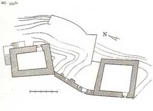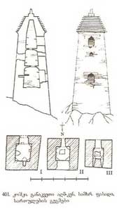 ა) სამხრეთის კოშკი ექვსართულიანია და ფუძეში არაწესიერ ტრაპეციას უახლოვდება (7.2X7 მ). I სართულზე შესასვლელი დასავლეთიდანაა. კარი ორივე მხრიდან შეისრულთაღიანია. დასავლეთ კედელში ერთი სარკმელი და ერთი პატარა ნიშია. ჩრდილოეთი კედლის გარდა, სამივე კედელს II სართულამდე მიყვება მარტივი პილასტრები. II სართულს აღმოსავლეთიდან შეისრულთაღოვანი შესასვლელი აქვს, იმავე კედელზე პატარა ღიობი და სარკმელია. სამხრეთ კედელზე ორი სარკმელია, საფეხურიანი რაფებით. დასავლეთ კედელში ორი ნიშია: ერთი მცირე, ხოლო მეორე - ღრმა და სათოფურიანი. ჩრდილოეთ და სამხრეთ კედლებში თითო მცირე ნიშია. III სართულის შესასვლელი აღმოსავლეთიდანაა და შეისრულთაღოვანია. კარების ჩრდილოეთით სარკმელია, სამხრეთით - ოთხკუთხა ნიში. სამხრეთის კედელზე ორი საფეხურრაფიანი სარკმელია. დასავლეთის კედელზე გეგმაში ნახევარწრიული ნიშია, კიდევ ორი ნიშია: მომცრო და მოზრდილი. ჩრდილოეთ კედელში სამი ნიშია. ორი მათგანი მომცროა, ოთკუთხა, ხოლო მესამე მოზრდილია და გეგმაში ნახევარწრიული. დიდი ზომის ნიში სათოფურითაა აღჭურვილი. IV სართულის დასავლეთ კედელში ფართო ღიობია, მის ორივე მხარეს თითო პატარა ნიშია. ჩრდილო და Aაღმოსავლეთის კედლებში ორ-ორი სათოფურია. V სართულის შემორჩენილი დასავლეთის კედელის ნაწილში ერთი სათოფურია, დანარჩენ კედლებზე კი ორ-ორი. VI სართულის აღმოსავლეთ და სამხრეთ კედლებზე თითო ფართო ღიობია. აღმოსავლეთ კედელში ერთი სალოდეცაა. ბ) ჩრდილოეთის კოშკის ხუთი სართულია შემორჩენილი. გეგმაში ის წაგრძელებულ ოთხკუთხედს წარმოადგენს (7.6X5.5 მ). I სართულზე შესასვლელი აღმოსავლეთიდანაა და შეისრულთაღოვანია. სამხრეთის კედელის შუა ნაწილში თაღოვანი სარკმელია, რომლის ორივე მხარეს თითო ნიშია: აღმოსავლეთით – პატარა, ხოლო დასავლეთით - უფრო მოზრდილი. II სართულზეც აღმოსავლეთიდანაა შეისრულთაღოვანი შესასვლელი. აღმოსავლეთის კედელზე პატარა ნიშია. დასავლეთ კედელში ორი ასეთივე ნიში და კიდევ ერთი სათოფურია, რომელიც გარეთა მხარეს მკვეთრად ვიწროვდება. სამხრეთ კედელში ორი საფეხურრაფიანი სარკმელია. ჩრდილო კედელზე დასავლეთ კედლის მსგავსი სათოფურია. III სართულის აღმოსავლეთ კედელში ფართო შესასვლელი, სარკმელი და ერთი პატარა ნიშია. დასავლეთ კედელში ორი სათოფური და ნიშია. ჩრდილოეთ კედელშიც ორი სათოფურია, ხოლო სამხრეთ კედელში - ერთი თაღოვანი სარკმელი. IV სართულის კარი სამხრეთის კედლის დასავლეთ კიდეშია მოთავსებული. ამ სართულის დასავლეთ კედელში ორი სარკმელია, ხოლო თითო-თითო - აღმოსავლეთისა და ჩრდილოეთის კედლებში. V სართული სანა