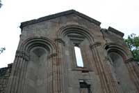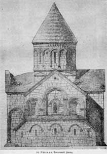 ფასადებზე, ისევე როგორც ინტერიერში, ჩანს ბევრი ფენა. პირველ რიგში ეს შეიძლება ვთქვათ ჩრდილოეთის მინაშენზე და ფასადების სხვა ნაწილებზე, სადაც შეიმჩნევა დიდი კონტრასტი. მინაშენი მოპირკეთებულია მცირე ზომის ქვებით, და ყველა დანარჩენი ფასადი კი არაჩვეულებრივად თლილი ქვით. ამასთან ამ მინაშენის გარდა ყველგან გამოყენებულია დეკორატიული თაღები. ძალიან ორიგინალურად არის გადაწყვეტილი აღმოსავლეთის ფასადი. ის გამოიყურება ორსართულიანად და ქვედა ნაწილი გავს მიშენებულს. სინამდვილეში ეს ორივე ნაწილი თანადროულია. ფასადის დათვალიერების დროს თვალში გვეცემა მისი ზედა ნაწილი, რომელიც დამუშავებულია სამი თაღით, რომელთაგან შუა უფრო განიერი და მაღალია, ვიდრე დანარჩენი. ცენტრალურ თაღში დიდი სარკმელია, რომელსაც განიერი ორნამენტირებული საპირე აქვს. ფასადის გამოწეული ნაწილი უფრო სადად არის გადაწყვეტილი, მასში გაჭრილია ხუთი სარკმელი.