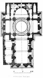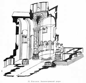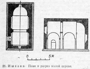 იშხანის მთავარი ტაძარი ჯვარ–გუმბათოვანი ნაგებობაა. ინტერიერში მკაფიოდ იკითხება ჯვრული კომპოზიცია. ჯვრის მკლავებიდან მხოლოდ გვერდითებია ერთნაირი სიგრძის. აღმოსავლეთის მკლავი შედარებით გვერდითა მკლავებთან და დასავლეთის მკლავთან თითქმის სამჯერ გრძელია. ჯვრის მკლავებიდან მხოლოდ აღმოსავლეთისა არის აფსიდალური ფორმის, დანარჩენი – სწორკუთხაა. ტაძრის საკურთხეველი, აფსიდის გარდა ორსართულიანია. ქვედა სართული წარმოადგენს უწყვეტ კოლონადას. მისი ნალისებრი თაღები ეყრდნობიან რვა სვეტს. სვეტებს სადა ბაზები და მდიდრულად ორნამენტირებული კაპიტელები აქვთ. თვითონ კოლონადა იწყება არა იატაკიდან, არამედ საკმაოდ მაღლა, რაც აძლიერებს მის დეკორატიულ ხასიათს. განაპირა თაღები დანარჩენებზე უფრო მაღალია, რაც პერსპეკტივის შთაბეჭდილებას ქმნის. საკურთხევლის მეორე სართულზე ორმაგი თაღები განლაგებულია ერთადერთი სარკმელის გვერდებზე. რაც შეეხება საერთო დონეს, თაღების ზედა ხაზი ემთხვევა სარკმელის თაღის ხაზს. პატრონიკეები განლაგებულია საკურთხევლის ორივე მხარეს და არ არის შეერთებული ერთმანეთთან. პატრონიკეებში მოხვედრა შეიძლებოდა მისადგმელი კიბით. მათი იატაკი არ არის ერთ დონეზე, ამიტომ თაღედიც სხვადასხვა დონეზეა.