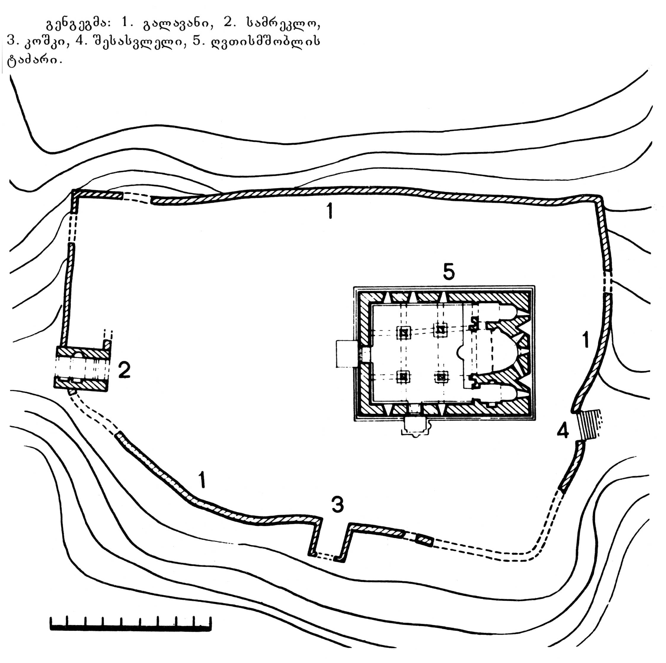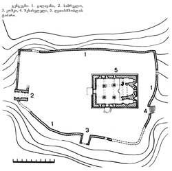 გ) გალავანი (40X25 მ; მაქსიმალური სიმაღლე 2 მ) აგებულია კირქვის კვადრებით. წყობა ირეგულარულია. გალავანი ფერდობის რელიეფს მიჰყვება. შესასვლელი გალავნის სამხრეთ კედელში ჩაშენებული იყო კოშკი, რომლის მხოლოდ 1,5 მეტრის სიმაღლის კედელია გადარჩენილი. გალავანზე მიშენებული ყოფილა აგრეთვე სენაკები.