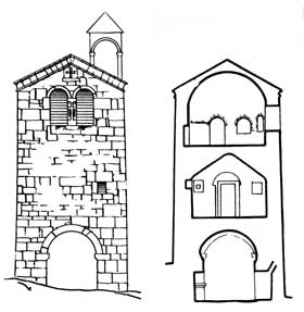 ბ) სამრეკლო არის ზევით შევიწროვებული, სამსართულიანი კოშკისებრი ნაგებობა (6,25 X4,95 მ), აგებული უხეშად დაკუთხული თლილი ქვის კვადრებით. XIX საუკუნის ბოლოს შეკეთებისას სამრეკლოს სახურავზე, სამხრეთ კუთხეში პატარა ფანჩატური დაუშენებიათ. სამრეკლოს პირველი სართული, რომელიც თავდაპირველად მონასტრის ეზოს შესასვლელი იყო (გაუქმებულია), ორ მხარეს მთელ სიგანეზე გახსნილია ერთნაირი თაღებით და გადახურულია ნახევარწრიული არაწესიერი მოხაზულობის კამარით. მის კედლებში დატანებულია ღრმა ნიშები. ჩრდილო კედელში ბუხარიცაა. ჩრდილო ფასადზე მიშენებული იყო მეორე სართულზე ასასვლელი ქვის კიბე. მეორე სართულის დაბალი სათავსი კამარითაა გადახურული, კედლებში ნიშებია. მესამე სართული შედარებით პატარაა და დასავლეთით გახსნილია ორმაგთაღიანი ღიობით. სამრეკლოს თავზე დაშენებული ორმხრივ გახსნილი ფანჩატური გადახურულია პირამიდული სახურავით და ნახევარწრიული თაღებით გაერთიანებულ მარტივკაპიტელებიან მრგვალ ბოძებს ეყრდნობა. ორფერდა სახურავი თაროს, წრეთარგისა და ლილვისგან შედგენილ ლავგარდანს ეყრდნობა. დასავლეთ ფასადზე მესამე სართულის ორმაგთაღიანი ღიობის შუა ბოძი შემკულია რელიეფური ჯვრითა და პრიმიტიული ორნამენტით. ფრონტონის კეხის ქვეშ ორმაგი თაღის ზევით გამოსახულია დეკორატიული ჯვარი.