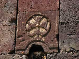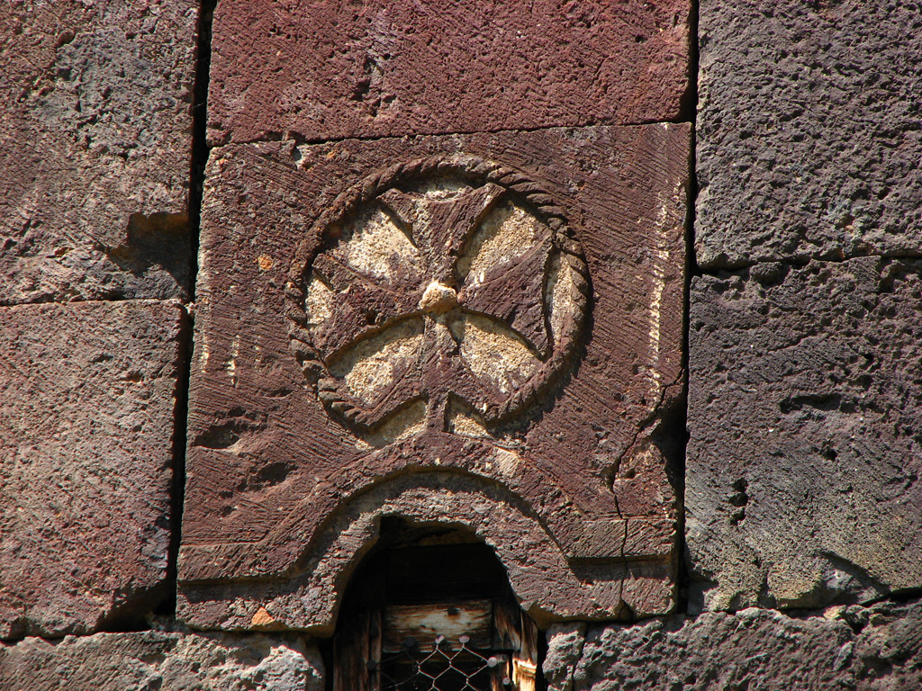 აღმოსავლეთი სარკმლის მამკობი ბოლნური ჯვრის წვერები უშუალოდ ებჯინება გრეხილი ლილვით შექმნილ მედალიონს. თავის მხრივ, ჯვარი აღმართულია მომცრო ბუნზე, რომელიც სარკმლის სათაურს ემყარება; ამის გამო მედალიონი არაა შეკრული _ იგი ჯვრის ქვედა მკლავის განზე გასულ წვერებს ებჯინება. ფონი ჯვრის მკლავებს შორის თეთრია (ქვის ზედაპირი კირის თეთრათია დაფერილი). ამგვარი ხერხი, შუქ-ჩრდილთან ერთად კიდევ უფრო გამოჰკვეთს გამოსახულებას მუქი ღვინისფერი ფასადის ერთიან სიბრტყეზე. მსგავსი, წრეში ჩაწერილი ჯვრები გვხვდება დირბში, ტაბაწყურში, ფრისში, გოსტიბეში.