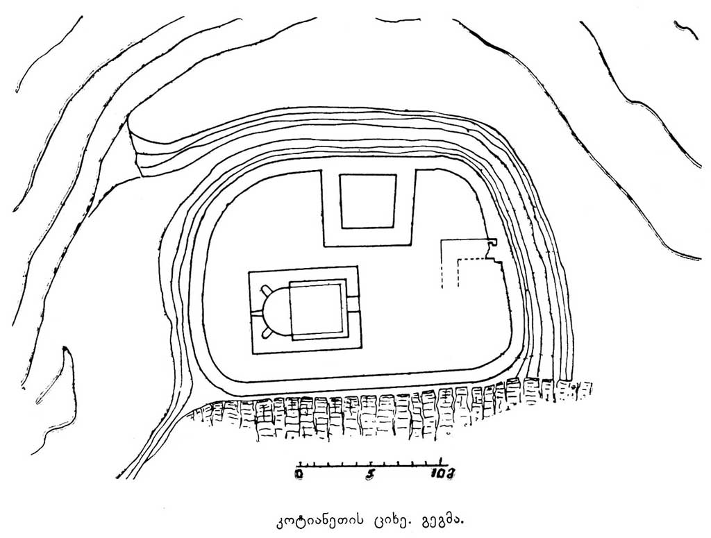 გ) ეკლესია - ეგრისის სამეფოს ციხეების უმრავლესობას თან ახლავს ეკლესია. გალავნის სამხრეთ-აღმოსავლეთის კუთხე თითქმის მთლიანად მოკავებული აქვს ეკლესიას. ეკლესიის სიმცირე ნაკარნახევია ციხის ზომებით; ასეთი მცირე ზომის ციხის შიგნით მხოლოდ მინიატურული ზომის ეკლესიის ჩადგმა შეიძლებოდა. ქვეყნის დაცვის სისტემაში კოტიანეთის ციხეს, ალბათ, უფრო საყარაულოს ფუნქცია ეკისრებოდა. აქ მზვერავები უნდა მდგარიყვნენ მცირე გარნიზონით.