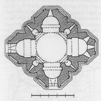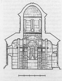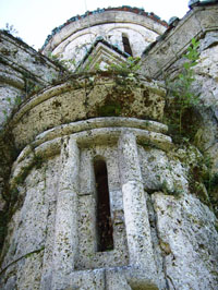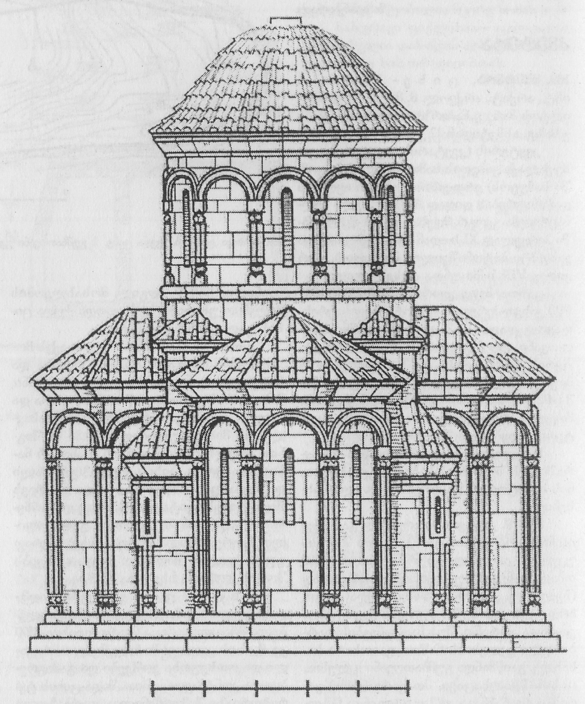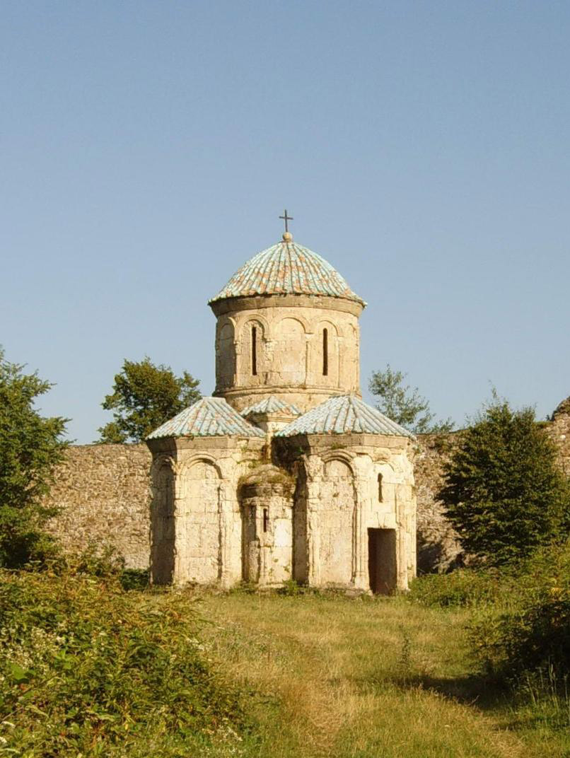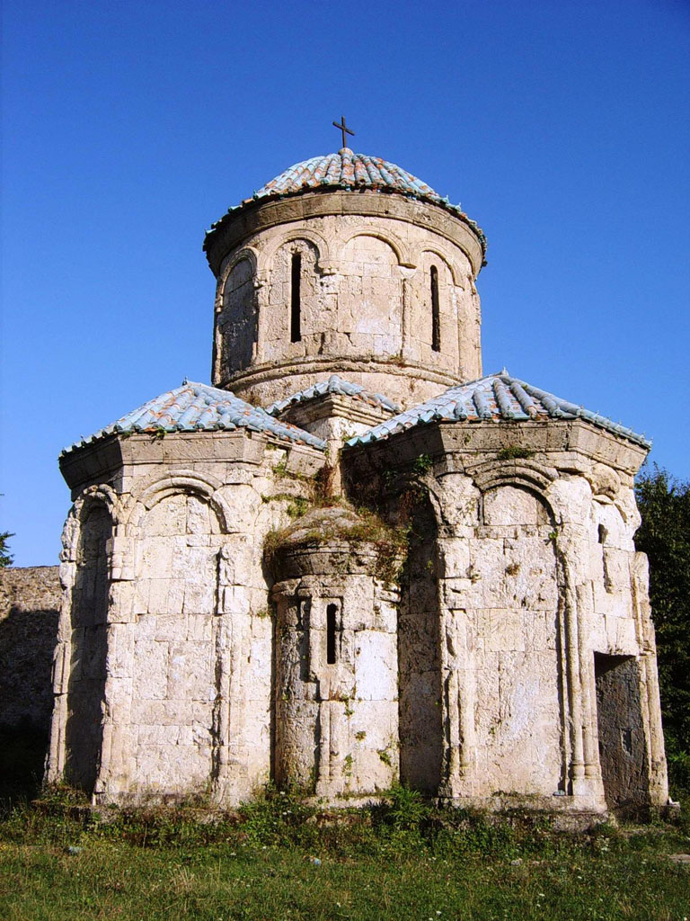 ა) გუმბათოვანი ეკლესია დგას ზედა ციხის აღმოსავლეთ ნაწილში. განეკუთვნება X საუკუნეს. შიგნიდან და გარედან მოპირკეთებულია შირიმის კარგად გათლილი, ნაწილობრივ დიდი ზომის, ფილებით, რომლებიც სწორ ჰორიზონტალურ რიგებს ქმნიან. ეკლესიის გეგმის საფუძველია ტეტრაკონქი, რომლის კომპოზიციურ ცენტრს წარმოადგენს გუმბათქვეშა კვადრატი. მასზე აღმართულია ნახევარსფერული გუმბათით დასრულებული ცილინდრული ყელი. მკლავებს შორის, გუმბათქვეშა კვადრატის ოთხივე კუთხეში გეგმით წრის სამი მეოთხედი მოხაზულობის თითო მაღალი თაღოვანი ნიშია. აღმოსავლეთ და დასავლეთ აფსიდების ბემები ჩრდილო და სამხრეთ ბემებზე ორჯერ უფრო ღრმაა, რის გამოც ჯვრის აღმოსავლეთ–დასავლეთის ღერძი რამდენამდე აღემატება სამხრეთ–ჩრდილოეთის ღერძს. შესასვლელები სამხრეთით და დასავლეთ აფსიდებშია გაჭრილი. ორივე კარი გარედან სწორკუთხაა, შიგნიდან–თაღოვანი. საკურთხეველში თანაბარი სიმაღლის სამი თაღოვანი სარკმელია. დანარჩენ აფისდებში კი – თითო. თითო თაღიანი სარკმელია მკვალებს შორის მოქცეულ ნიშებშიც. ჯვრის ოთხივე მკლავის ბოლოებში სამ–სამი შეჯგუფებული ნახევარსვეტია, რომლებსაც საერთო ოთხწახნაგა კაპიტელი აგვირგვინებს. კაპიტელზე დაყრდნობილია როგორც გუმბათქვეშა ისე მკლავბეშორის მოქცეული ნიშნების თაღები. გუმბათქვეშა კვადრატიდან გუმბათის ყელის წრიულ საფუძველზე გადასასვლელად გამოყენებულია ერთი მეორეზე გადმომჯდარი თაღების სისტემა. გუმბათქვეშა თაღებსა და მკლავებს შორის მოქცეული ნიშების თაღების თავზე, კონსოლებზე დაყრდნობილი და საფეხურით გამოშვერილი თითო თაღია. ნიშების თაღების ზემოთ (გუმბათქვეშა თაღების წვერის დონეზე) მოწყობილია კიდევ ორ–ორი ასეთი თაღი რომელთა შორის მოქცეული არეები შევსებულია შიგნითკენ ოდნავ გადმოხრილად დაწყობილი ქვის ფილებით, რომლებიც თაღებთან ერთად გუმბათის ყელის წრიულ საფუძველს ქმნის. გუმბათის ყელს მარტივი პროფილის სარტყელი შემოუყვება. გუმბათის ყელში ექვსი თაღოვანი სარკმელია გაჭრილი.