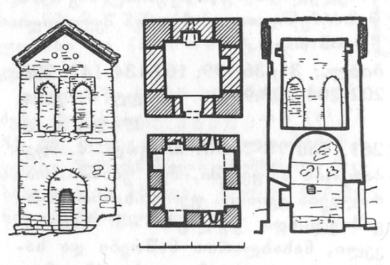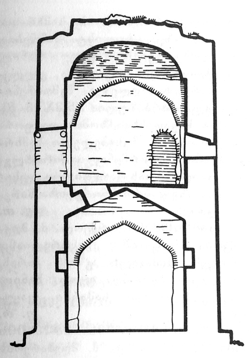 ა) მაღალაანთ ეკლესია, დარბაზულია (12,2X10,6 მ), ნაგებია მოყვითალო ფერის ქვიშაქვის კარგად გათლილი კვადრებით. კონსტრუქციული ნაწილები (პილასტრები, კაპიტელები, საბჯენი თაღები, კარის თაღი და წირთხლები) თლილი ქვისაა. ეკლესია ორსაფეხურიან ცოკოლზე დგას, შესასვლელი სამხრეთიდანაა. განიერი ნახევარწრიული აფსიდის ღერძზე სარკმელია, მის გვერდებზე – თითო პატარა ნიში. ეკლესიას კიდე სამი სარკმელი აქვს: ერთი – დასავლეთით, ორი – სამხრეთით. ჩრდილოეთით მოზრდილი კარია, საიდანაც შეიძლება კონქის თავზე ასვლა. დარბაზის გრძივ კედლებზე წყვილი პილასტრია, რომლებსაც ეყრდნობა ცილინდრული კამარის საბჯენი თაღი.