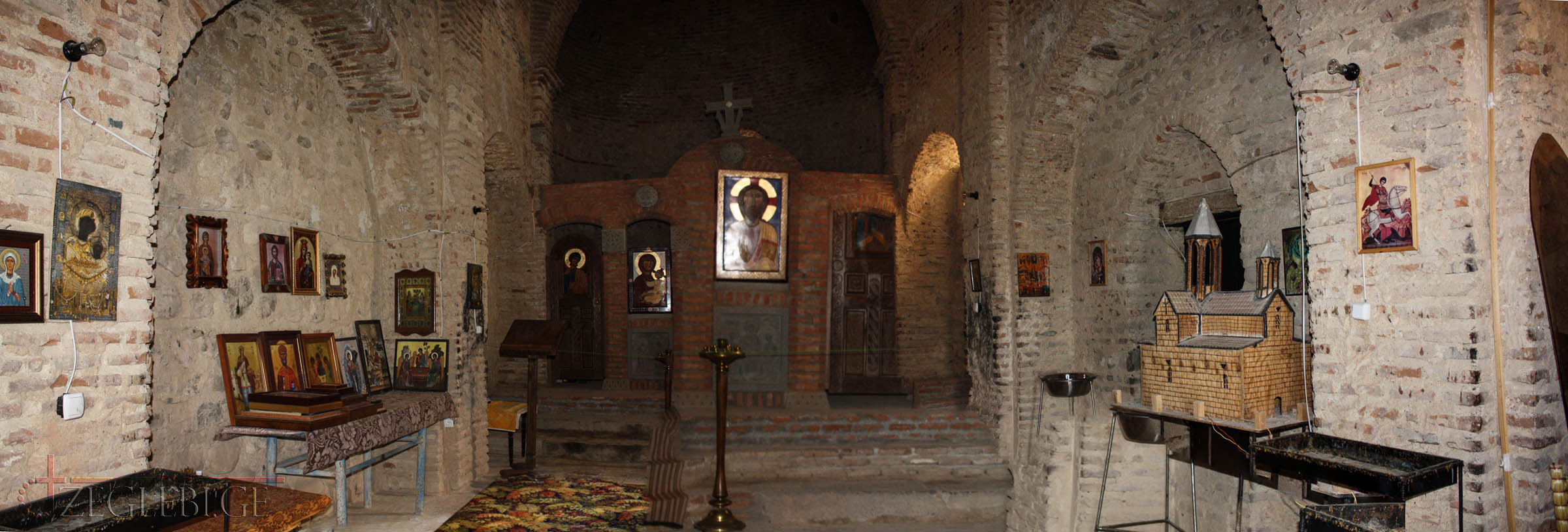 ეკლესიის საკურთხევლის აფსიდი ნავის მთელ სიგრძეს მოიცავს და პასტფორიუმები არ ახლავს. მასში სამისწორკუთხა ნიშაა დაყოლებული. გუმბათქვეშა თაღები მცირედ შეისრულია, სხვა ყველა თაღი ნახევარწრიულია, მხოლოდ ერთ ნიშას აქვს შეისრულთაღოვანი დაბოლოვება და მასში სამხრეთი შესასვლელია ჩასმული. კამარის საბჯენსა და გუმბათქვეშა თაღებს ქუსლებთან იმპოსტები ახლავს. განათების სისტემა კახეთის სხვა ამ ხანის ძეგლების მსგავსია – აღმოსავლეთით და დასავლეთით თითო სარკმელია გაჭრილი, გრძივ კედლებში კი თითოეულ მხარეს ორ-ორი. ისინი ქვემოთაა ჩასმული თაღოვან ნიშებში. სამხრეთ თაღს ზემოთ, გუმბათქვეშა ნაწილში კიდევ ერთი სარკმელია გაჭრილი, გუმბათის ყელში კი ექვსი მაღალი და ვიწრო ღიობია მოთავსებული. ქვედა კორპუსის სარკმელთა თავისებურება ისაა, რომ ისინი საფასადო მხარესაც ფართოვდება. შესასვლელი ორია – სამხრეთით და დასავლეთით.