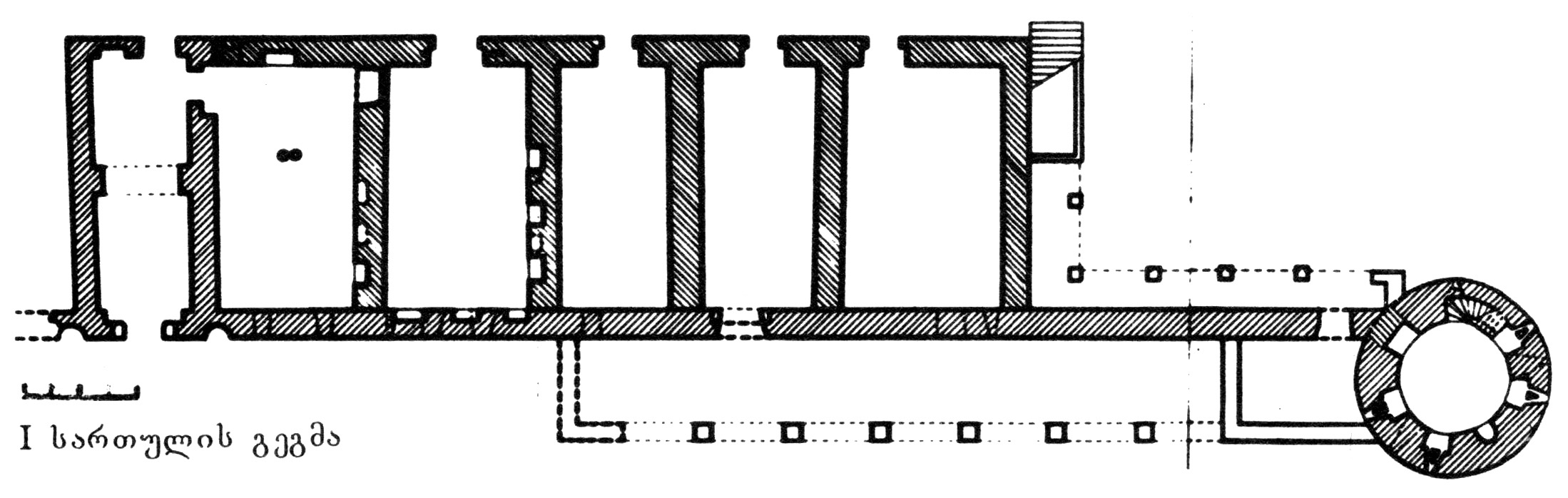 ე) სასახლის ადრე აშენებული (32X10 მ) სარდაფის სართულში, კარიბჭის გარდა ხუთი სათავსია, რომელთაგან ოთხს დამოუკიდებელი შესასვლელი აქვს ჩრდილოეთიდან. კარიბჭის მხრიდან პირველი ორი სათავსის კედლებში მცირე თაღოვანი ნიშებია. სათავსების სამხრეთის კედელში მცირე სწორკუთხა სარკმლებია, რომლებიც გარეთკენ ვიწროვდება. აღმოსავლეთის კედელზე მეორე სართულზე ასასვლელი ქვის კიბეა მიდგმული.