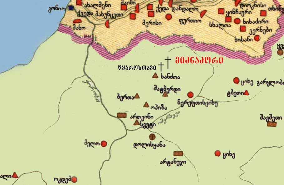 ა) მიძნაძორის მონასტერი გაშენებულია დაფერდებულ მინდორზე მდინარე კარჩხალას პირას, მის მარცხენა ნაპირზე. ამჟამად აქ შემონახულია ძლიერ დანგრეულ ნაგებობათა მცირე ნაშთები. მონასტრის ეკლესიისაგან გადარჩენილია მხოლოდ ჩრდილოეთის მკლავი, დასავლეთის მკლავის ჩრდილოეთ კედელი და სამკვეთლოს ნაწილი. შენობის მთელი სამხრეთ ნაწილი და საკურთხევლის აფსიდი გამქრალია. გადახურვა შემოინახა მხოლოდ სამკვეთლოში. ეკლესიის არქიტექტურული კომპოზიციის სრულად წარმოდგენა ხერხდება ნ. მარის აღწერის მონაცემების მოშველიებით – მისი მოგზაურობის დროს, 1904 წელს შენობა შედარებით უკეთეს მდგომარეობაში იყო. კერძოდ, ჯერ კიდევ განირჩეოდა საკურთხევლის აფსიდის კვალი.