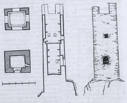 ა) კოშკი (3.8ხ3.8 მ) ოთხსართულიანია (სიმ. 12.8 მ), შესასვლელი I სართულზეა, სამხრეთით, მიწიდან 2.5. მ სიმაღლეზე. კარი ნახევარწრიული თაღითაა დასრულებული და წირთხლებში საურდულე ხვრელები აქვს. დასავლეთით მოგვიანებით გაჭრილია გასასვლელი, რომელიც კოშკს ციხე-სახლის ციხე-სახლის II სართულთან აკავშირებს. ჩრდილოეთ კედელში ორი სათოფურია, აღმოსავლეთისაში - ერთი. II სართულის სამხრეთ კედელში დიდი ზომის, ნახევარწრიული თაღით დასრულებული სარკმელია, ხოლო ჩრდილოეთ და დასავლეთ კედლებში - თითო სათოფურია. III სართულზე სამხრეთით, აღმოსავლეთითა და ჩრდილოეთით თითო სარკმელია. IV სართულზე, ოთხივე მხარეს, დიდი ზომის ოთკუთხა ღიობებია. სართულშუა გადახურვა ხის კოჭებზე იყო გამართული. პირველი სამი სართული ოჯახის წევრთა თავშესაფარიც იყო და სათავდაცვოც, IV სართული - მხოლოდ სათავდაცვო. კოშკს მიწურბანიანი სახურავი ჰქონდა.