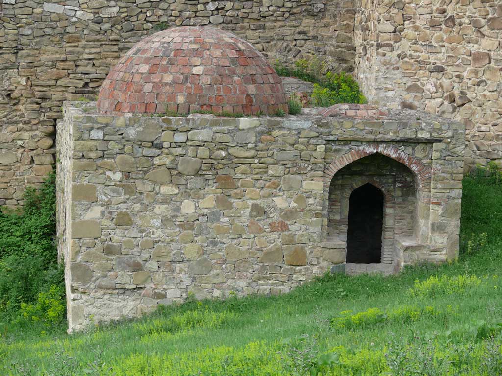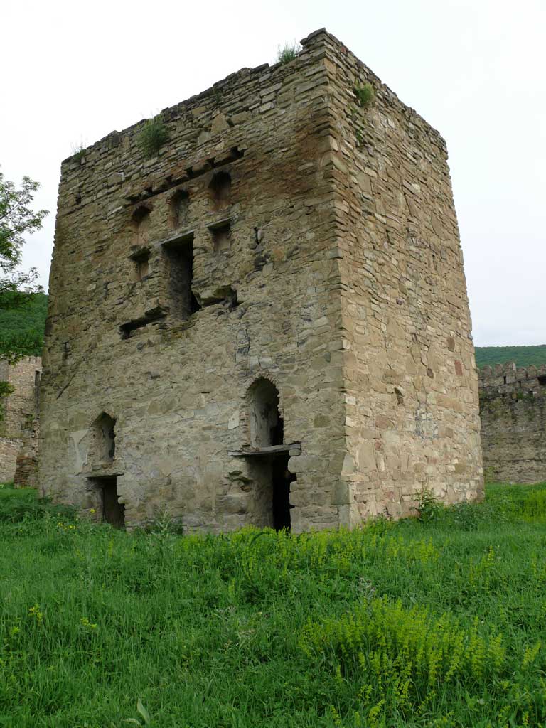 ბ) ეზოში სამსართულიანი ოთკუთხა კოშკი დგას. შესასვლელი მეორე სართულზეა. აქ პატარა ტამბურში, მესამე სართულზე ასასვლელი კიბე და მეორე სართულის სათავსებში შესასვლელი კარია. სართულებს ისრული გადახურვა აქვთ. ზედა სართულების კედლებში სათოფურებია დატანებული.