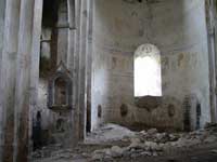 ეკლესიის ცენტრალური ნავი აღმოსავლეთიდან დაბოლოებულია აფსიდით, გვერდითა ნავები – ოთხკუთხედით. აფსიდის გარშემოწერილობა ნალისებრია. ეკლესიის საკურთხევლის ნაწილს, აფსიდის გარდა, აქვს პასტოფორიუმები. გვერდითა ნავების მხრიდან ყოველ სათავსს ცალკე შესასვლელი აქვს, შიგნით ისინი გაყოფილია კედლით, რომელიც ამჟამად დანგრეულია. ეს ოთხკუთხა სათავსები ერმანეთთან არის დაკავშირებული პატარა კარებით და ნათდება აღმოსავლეთიდან პატარა სარკმლებით.