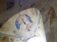 ინტერიერის კედლები ამოყვანილია კარგად თლილი ქვით, მობათქაშება ძლიერ დაზიანებულია. ფრესკების ფრაგმენტები შემორჩენილია აფსიდის კედლებზე. საინტერესოა კომპოზიცია ფრესკის, რომელიც განლაგებულია სარკმლის თაღზე. მედალიონში გამოსახულია ქალის პორტრეტი, რომელსაც მარცხენა ხელში ოთხთა ეკლესიის ზუსტი მოდელი უკავია. ტიერების ვარაუდით, აქ გამოსახულია ან წმინდა ელენე, ან წმინდა ეკატერინე.