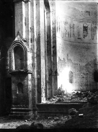 აფსიდის ირგვლივ ორი საფეხურია, საკურთხევლის ამაღლება სვეტების პირველ რიგს აღწევს. ამ სვეტებზე დასავლეთიდან მოწყობილია დიდი ნიშები, რომლის მთავარი ფასდები მდიდრულად დეკორირებულია. სავარაუდოდ ეს ნიშები ხატებისათვის იყო განკუთვნილი.