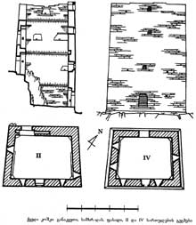 გ) ქვედა კოშკი (5,2X4,2 მ) ოთხსართულიანია (შემორჩენილი სიმაღლე 7,25 მეტრია). პირველ სართულზე შესასვლელი სამხრეთ-აღმოსავლეთიდანაა, ამ კედელში ერთი სათოფურიცაა. მეორე სართულზე შესასვლელი ჩრდილო-დასავლეთიდანაა. ჩრდილოეთ-აღმოსავლეთის და სამხრეთ-დასავლეთის კედლებში თითო სათოფურია, სამხრეთ-აღმოსავლეთის კედელში - სარკმელი და ორი სათოფური. მეორე და მესამე სართულების კედლები ნაკელნარევი თიხითაა შელესილი. მესამე სართულზე შესასვლელი ჩრდილო-დასავლეთიდანაა, ამ სართულის ორ-ორი სათოფურია, სამხრეთ-აღმოსავლეთ კედელში კი ორი სათოფური და სარკმელი. მეოთხე სართულის ჩრდილო-დასავლეთ კედელში - ერთი სათოფური, სამხრეთ-აღმოსავლეთისაში - ერთი სარკმელი და ორი სათოფური, სამხრეთ-დასავლეთისაში - ორი სათოფური. სამივე კოშკში სართულშუა გადახურვა ხის ყოფილა, შემორჩენილია კოჭების ბუდეები, სართულები ერთმანეთს ხის მისადგმელი კიბით უკავშირდებოდნენ.