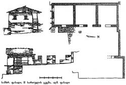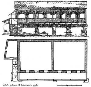 შელესილია ტიხრით, ორ ნაწილადაა გაყოფილი. მეორე სართული თივის შესანახად გამოიყენებოდა. პირველი და მეორე სართულები ერმანეთს სართულშუა გადახურვაში მოწყობილი ხვრელით უკავშირდება. მეორე სართულის კედლები, გარდა ჩრდილოეთისა, მთელ სიმაღლეზე გახსნილია. სამხრეთის ღიობის შუაში ხის ბოძია დადგმული, რომელსაც ღიობის გადამხურავი ხის ძელი ეყრდნობა. ამ ძელზე დადგმულია ხის მოკლე ძელებისაგან გამოყვანილი სვეტი, რომელზედაც დაყრდნობილია თავხე.