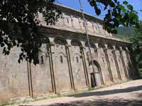 გვერდითა ფასადებს მეტი მსგავსება აქვს, ვიდრე ვიწროებს. ფასადების სიბრტყეები განლაგებულია ორ გეგმათ, გვერდითა ნავები წინ გამოდის, ცენტრალური ნავი უფრო მაღალი და ვიწროა და ამიტომ უფრო ღრმაა. ფასადის ორივე ნაწილი დამუშავებულია თაღედით, მაგრამ თაღედებში დიდი განსხავებაა. ფასადის ქვედა ნაწილზე ათი თაღია, ზედაზე – თორმეტი. თაღები, ასევე როგორც ინტერიერში, ნახევრადწრიულია. პილასტრები და ქვედა რიგის თაღები ერთნაირი პროფილის არის, ოთხკუთხედი და ორსაფეხურიანი. კაპიტელები ცალხაზოვანია. შენობის ქვედა იარუსების პილასტრებს არ აქვს ბაზები. ტაძრის ცოკოლი საფეხურებიანია, მართკუთხედი. ფასადებზე სარკმლები განლაგებულია სიმეტრიულად. ქვედა რიგში ცამეტი სარკმელია, მათგან ქვედა რიგს ქმნის ექვსი ერთნაირი სარკმელი, ზედას – შვიდი. ამ შვიდიდან ყველა ერთნაირი ზომისაა, გარდა ცენტრალურისა, რომელიც ორჯერ უფრო მაღალია. ზედა იარუსზე ხუთ-ხუთი საკმაოდ დიდი სარკმელია. ისინი განლაგებულია თაღების ცენტრში, ერთის გამოტოვებით. პირველი იარუსის სარკმლები დეკორირებულია, მათი დაბოლოების ქვები სხვადასხვანაირად არის დეკორირებული. ზოგიერთ ქვებზე მხოლოდ ორნამენტებია, ზოგიერთზე კი გამოკვეთილია ცხოველები და ფრინველები. მეორე იარუსის დეკორირება ნაკლებადაა გამოხატული, თაღები კედლების შესაბამისად დაბალია, მათი პროფილე შერბილებულია. სარკმლების სიბრტყეები ბოლოვდება მარაოსებურად განლაგებული ფერადი ქვებით.