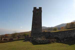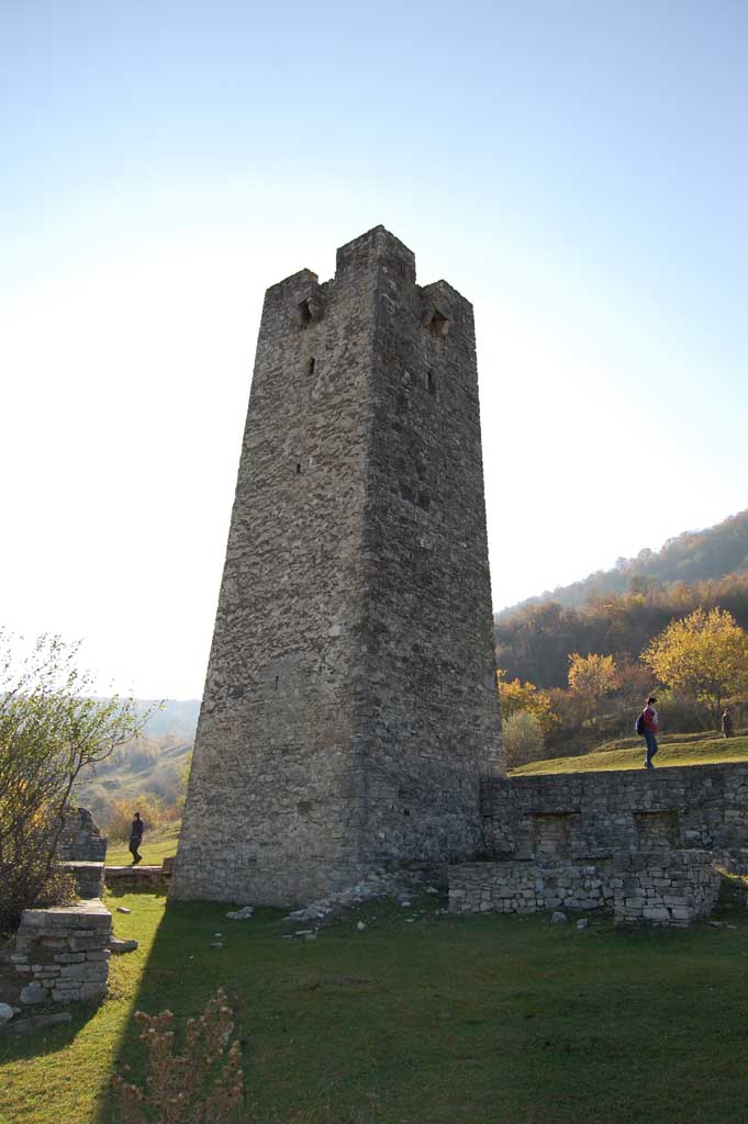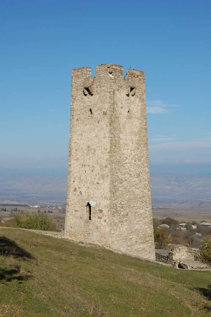 ბ) მთავარი ნაგებობაა ექვსსართულიანი კოშკი (5,5X5,5 მ), რომელიც ზემოთკენ ოდნავ ვიწროვდება. ნაგებია ნატეხი ქვით. ძალზე დაზიანებულია. ხანძარს გაუნადგურებია ხის სართულშორისი გადახურვები (რესტავრაციის დროს ბოლო სართულს რკინა-ბეტონის გადახურვა გაუკეთდა). კოშკში შესასვლელი მეორე სართულზეა. ამავე სართულზე, კარის გარდა, სამ კედელში თითო სარკმელია. პირველი სართული ყრუ იყო, ბოლო, მეექვსე სართული კი მაღალკედლებიან ბანს წარმოადგენდა. მას ოთხივე მხარეს სალოდეები ჰქონდა. სათოფურები ყველა სართულზეა, მესამე სართულზე ყველაზე მეტი.
