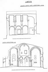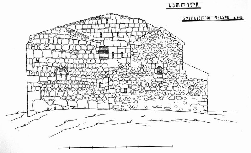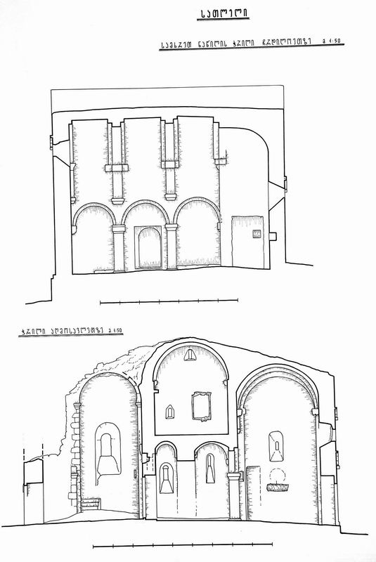 თავდაპირველი ბაზილიკის კედლები შიგნითაც და გარეთაც ამოყვანილია უხეშად დამუშავებული თანაბარზომიერი ქვებით. ისინი სწორ ჰორიზონტალურ რიგებად ლაგდება, მაგრამ ერთმანეთს მჭიდროდ არ ერგება, ქვებს შრის რჩება დიდი ღრიჭოები, რომლებიც კენჭებითა და კირის ხსნარით არის ამოვსებული. ასევეა გამოყვანილი აფსიდის კონქიც. ზოგიერთი ნაწილისათვის (თაღები, იმპოსტები, ღიობთაწირთხლები, ბურჯების კუთხეები) სუფთად თლილი ქვა უხმარიათ.