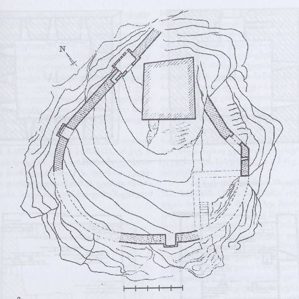 ა) გალავანი მრავალ თავდაცვით ელემენტს შეიცავს. ციხის ერთადერთი შესასვლელი აღმოსავლეთიდანაა. მის წინ, კლდეზე, ამოკვეთილია საფეხურები. კარი ხისა უნდა ყოფილიყო, წირთხლებთან შემორჩენილია ურდულის ბუდეები. ციხის მშენებელს, მიუხედავად ეზოს დონის დიდი სხვაობისა, გალავანი ერთ სიმაღლეზე დაუყენებია, რის შედეგადაც, თუ ჩრდილოეთით კედლის სიმაღლე ოთხ მეტრამდეა, მოპირდაპირე მხარეს ათ მეტრს აღწევს. ამის მიხედვითაა განლაგებული საბრძოლო იარუსებიც. დაბალ მხარეს ორი იარუსია, მაღალ მხარეს — სამი. მებრძოლთა დასადგომი იარუსები ხისა იქნებოდა. აღნიშნულ იარუსებზე განლაგებულია სათოფეები და სალოდეები. მოახლოებული მტრის წინააღმდეგ იყენებდნენ სათოფეებს, ხოლო ციხის ძირას მისულს სალოდეებიდან ქვებს აყრიდნენ, ან ცხელ სითხეს ასხამდნენ. გალავნის ჩრდილოეთით ნაწილში სათავსია ჩართული. მის კედლებში სათოფეებიც ბლომადაა.
