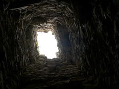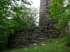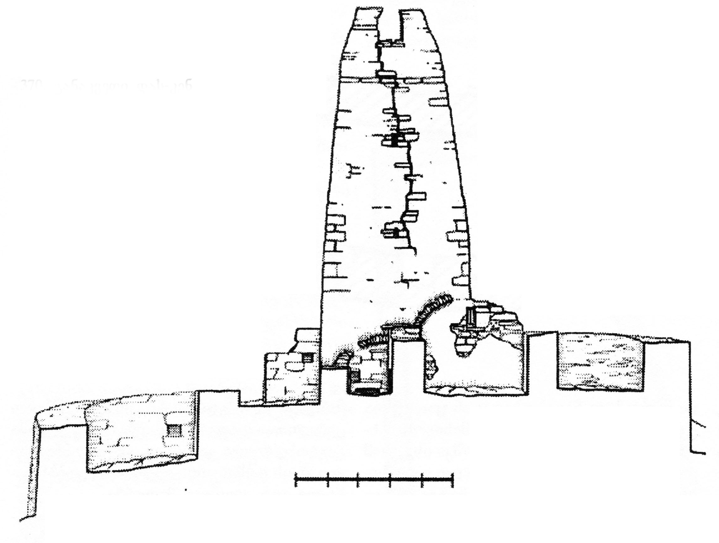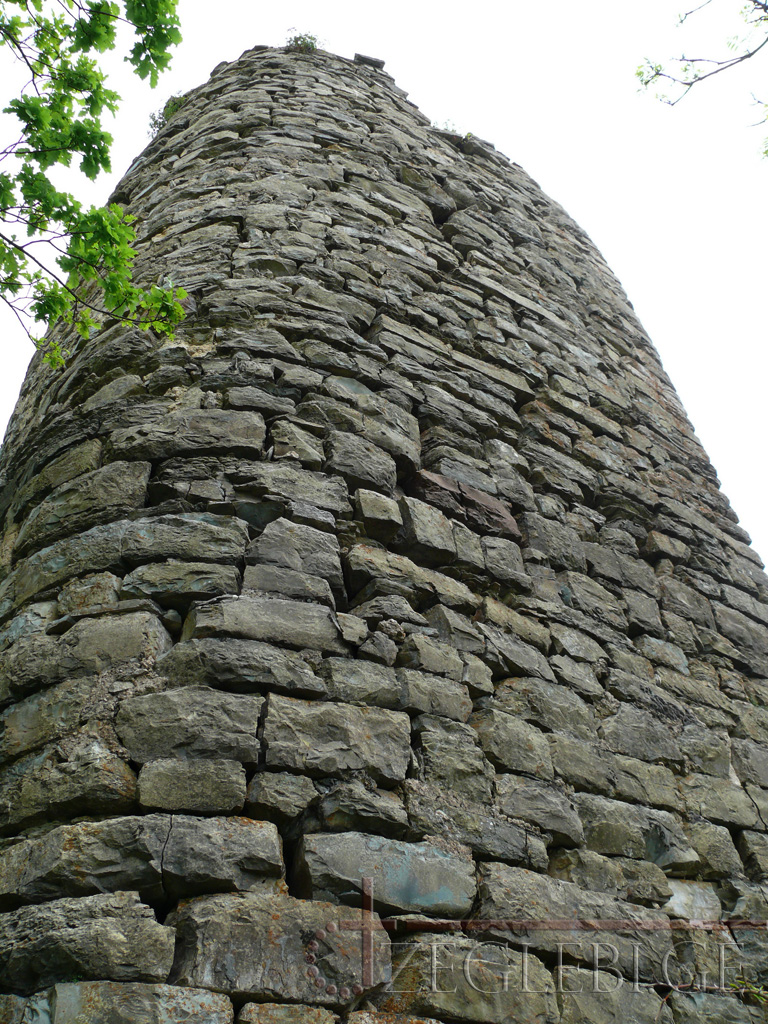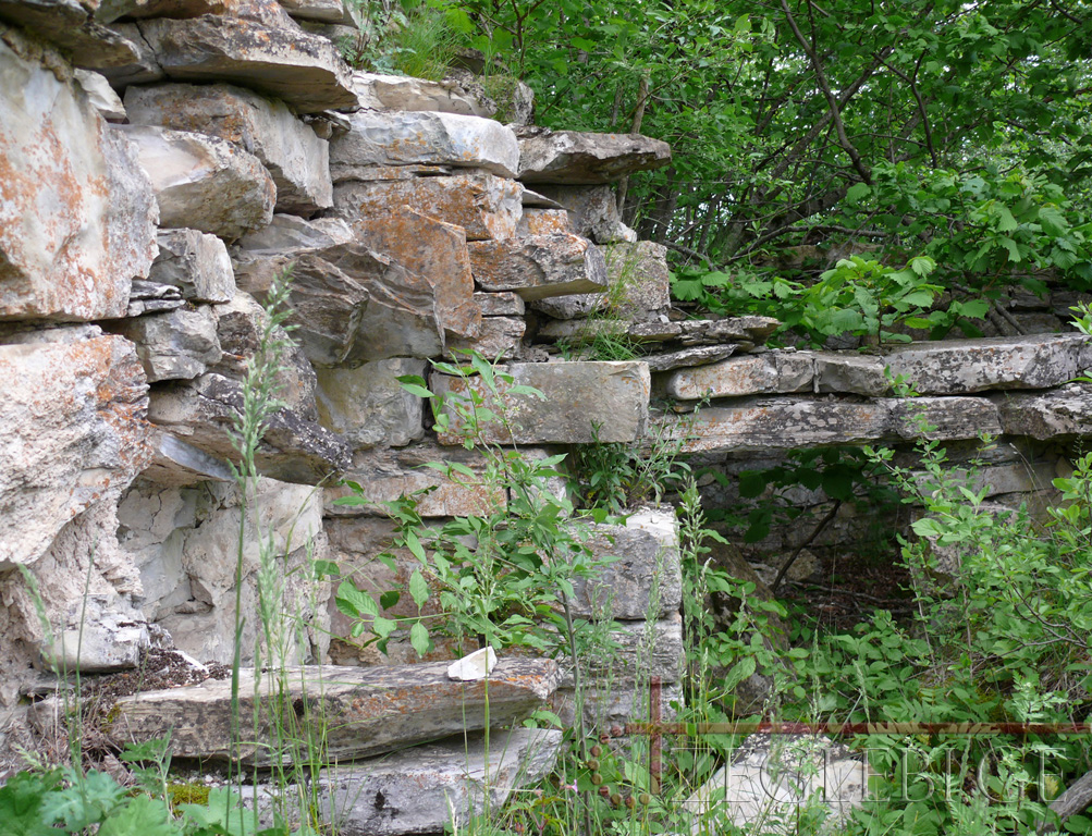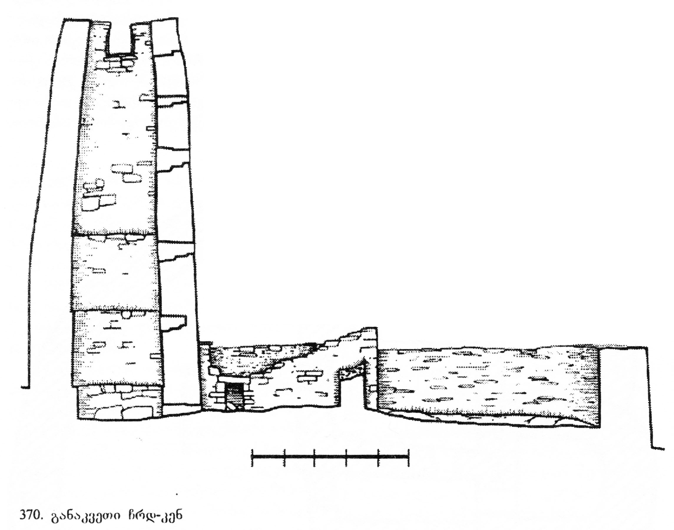 დ) გალავანი წრიული ფორმისაა (დიამეტრი 21 მ), შემორჩენილია მთელ პერიმეტრზე. შესასვლელის (შემორჩენილია ჩრდილოეთის წირთხლის ნაწილი) დასავლეთით სწორკუთხა ნიშია.