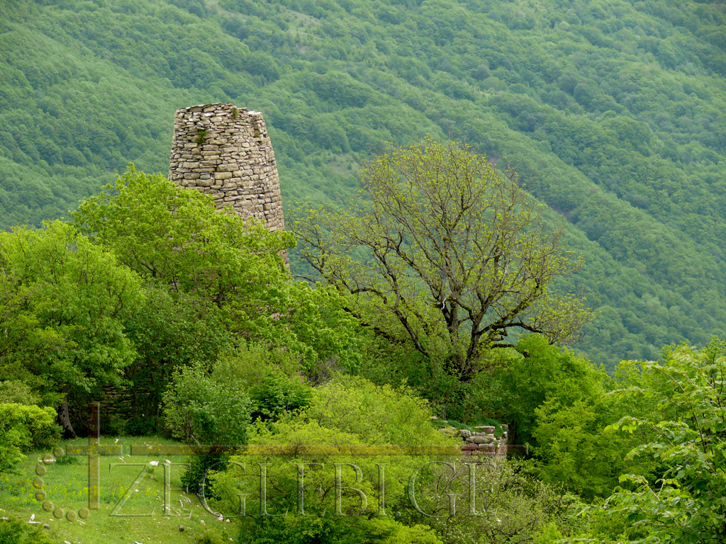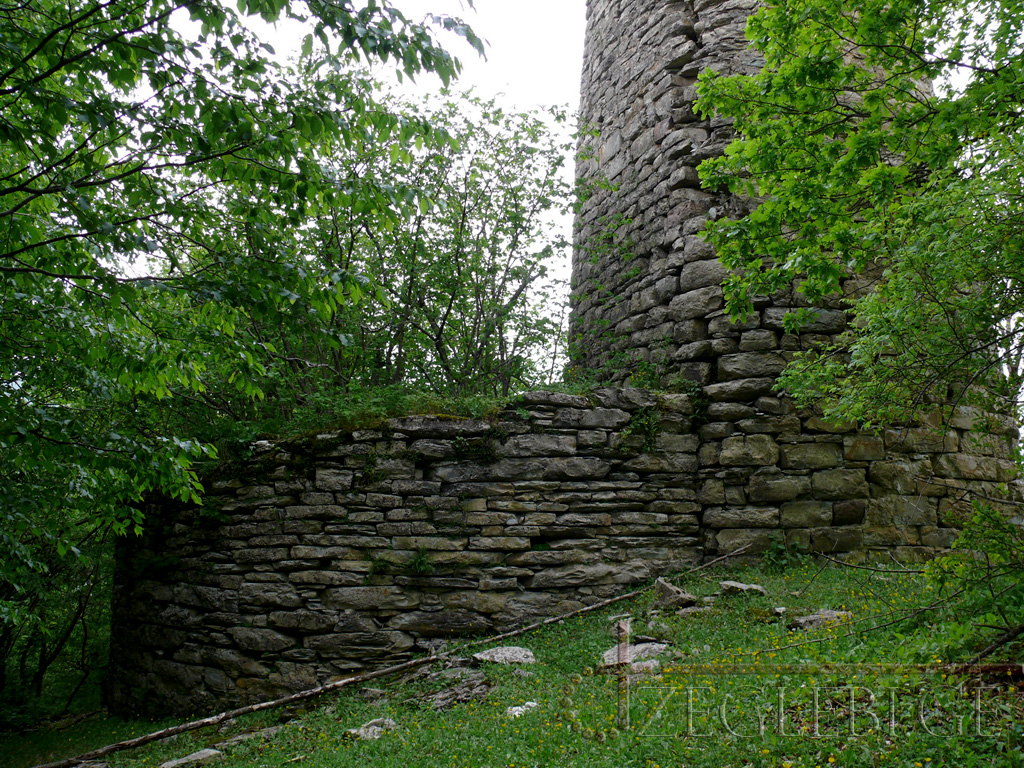 ბ) ზუგიანი კოშკი ექვსსართულიანია, ზემოთ მკვეთრად შევიწროებული და ზურგით გალავანში ჩართული. დაზიანებულია: მონგრეულია VI სართულის კედლების ზედა ნაწილები, ჩამოშლილია ხის სართულშუა გადახურვები, თითქმის მთელ სიმაღლეზეა გაბზარული სწორი კედელი, I სართული დაახლოებით 1 მ სიმაღლეზე მიწითა და კედლებიდან ჩამონაშალი ქვებითაა ამოვსებული. შესასვლელი I სართულზეა, სწორი კედლის სამხრეთ კიდეში. კარი სწორკუთხაა. III, IV და V სართულებს (სწორ კედელში) თითო სწორკუთხა სარკმელი აქვს. დანარჩენი კედლები ყრუა. მსგავსი სარკმელია II სართულის სწორ კედელშიც, რომელიც მოგვიანებით (როგორც ჩანს, ეკლესიის სამხრეთ მინაშენის აგებისას) ამოუშენებიათ.